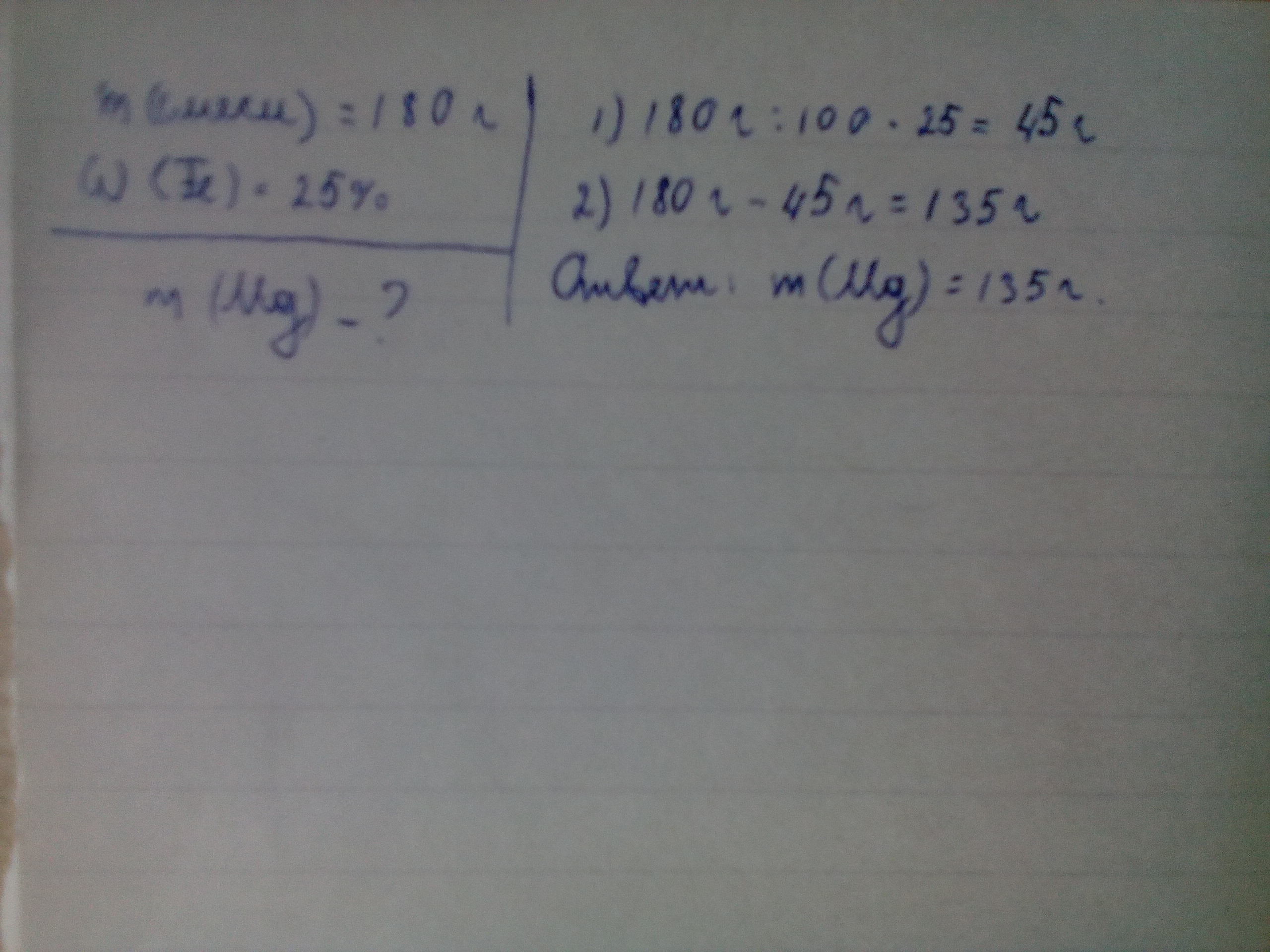 смесь железа Fe и магния Mp равно 180г массовая доля железа 25% найдите массу магния в смеси. Помогите пожалуйстаа!!!