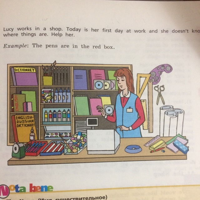 Lucy works in a shop. Today is her first day at work and she doesn’t know where things are. Help her. example: the pens are in the red dox.