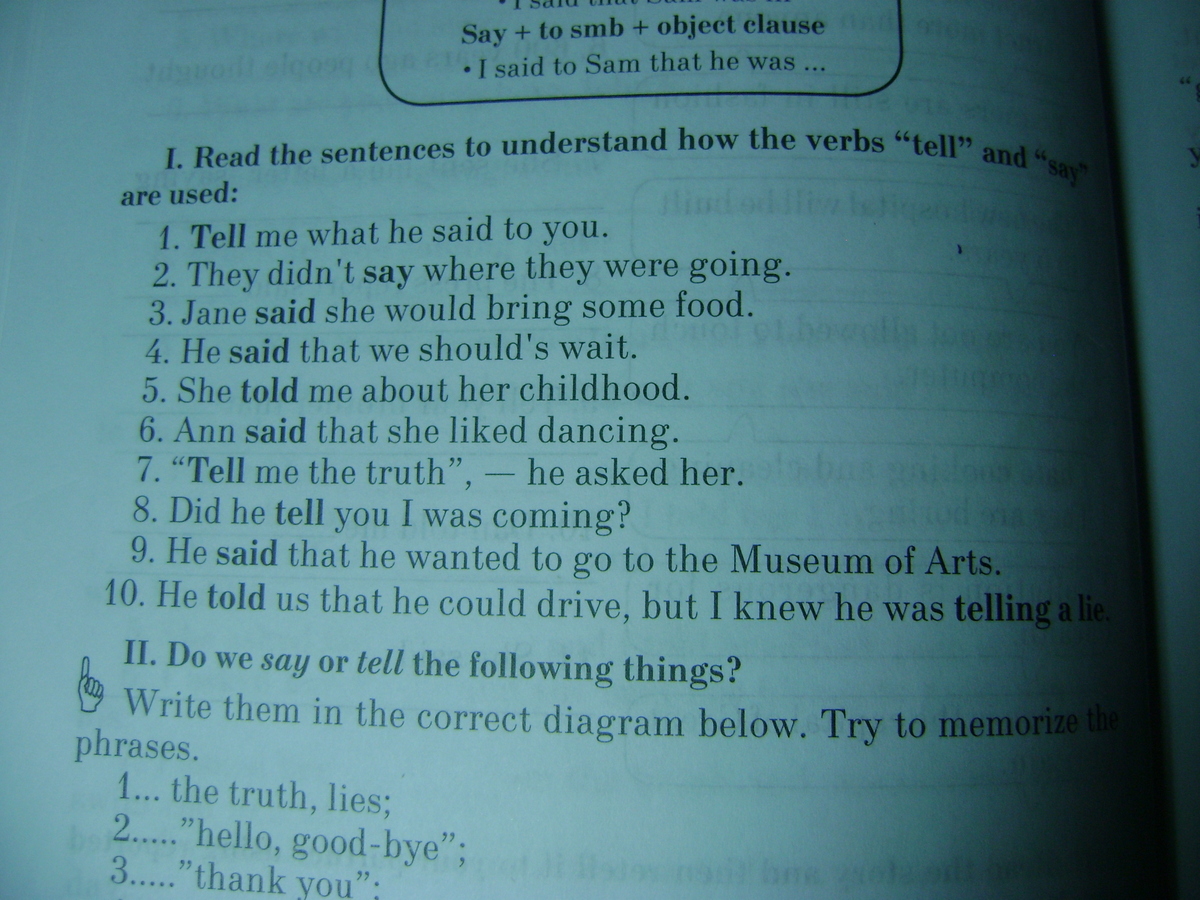 1 , Скажи что он сказал тебе 2 . Они не сказали куда они пошли . 3. Джеин сказала что хочет принести еды . 4. Он сказал что мы не должны ждать . 5. Она рассказала мне о ее детстве . 6. аня сказала она любит танцевать . 7.Скажи мне правду - сказал он ей . 8. Что он сказал тебе когда Я пришла(пришел ) . 9. Он сказал что он хочет пойти в Арт галерею . 10. Он сказал нам что мог ехать , но я знаю что он сказал неправду ( или солгал )
