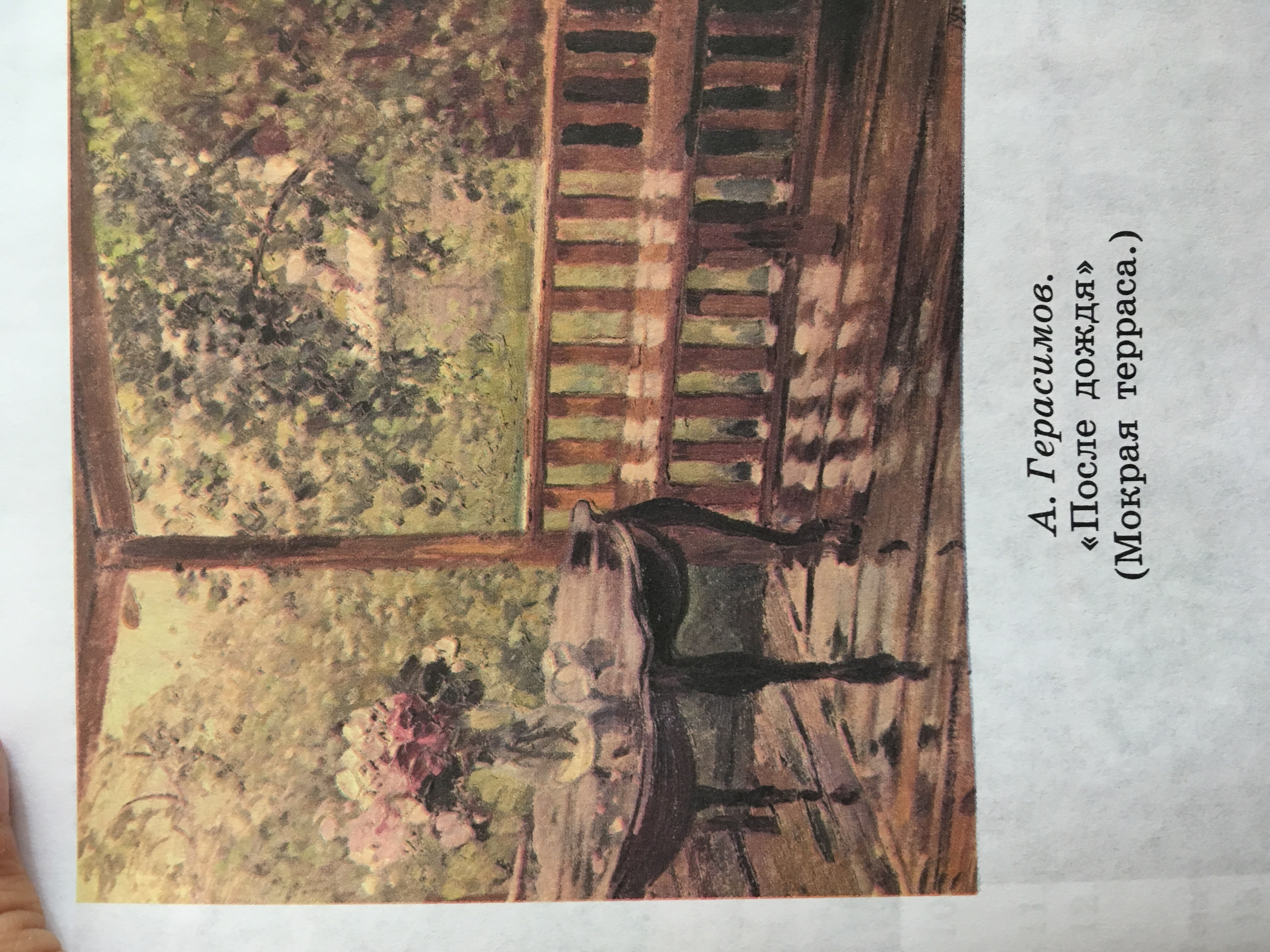 На картине А. М. Герасимова «После дождя» изображена терраса в теплый летний день. Только что прошел сильный ливень. Повсюду мокрый блеск. Ярко сверкает залитый водой пол, блестят перила и скамейки. Влажным блеском сияет мокрый стол на резных ножках. В лужах отражаются перила, листва окружающих террасу деревьев. Дождь был сильным, настоящий летний ливень. От ударов крупных капель упал стакан, стоявший на столе рядом с кувшином с цветами, осыпались лепестки с цветов и прилипли к мокрой поверхности столика. Ветки деревьев в саду, кажется, слегка прогнулись под тяжестью омытой дождем листвы. Их зелень стала яркой, сочной, посвежевшей после ливня. Пышные деревья в саду освещены еще неярким солнцем. Небо серое, но уже начинает светлеть, как вымытые после долгой зимы окна. Неяркий свет льется и на крышу сарая, которая виднеется сквозь листву в глубине сада. Она как будто покрыта серебром, настолько украсил ее дождь и лучи солнца, с трудом пробивающиеся сквозь тучи.