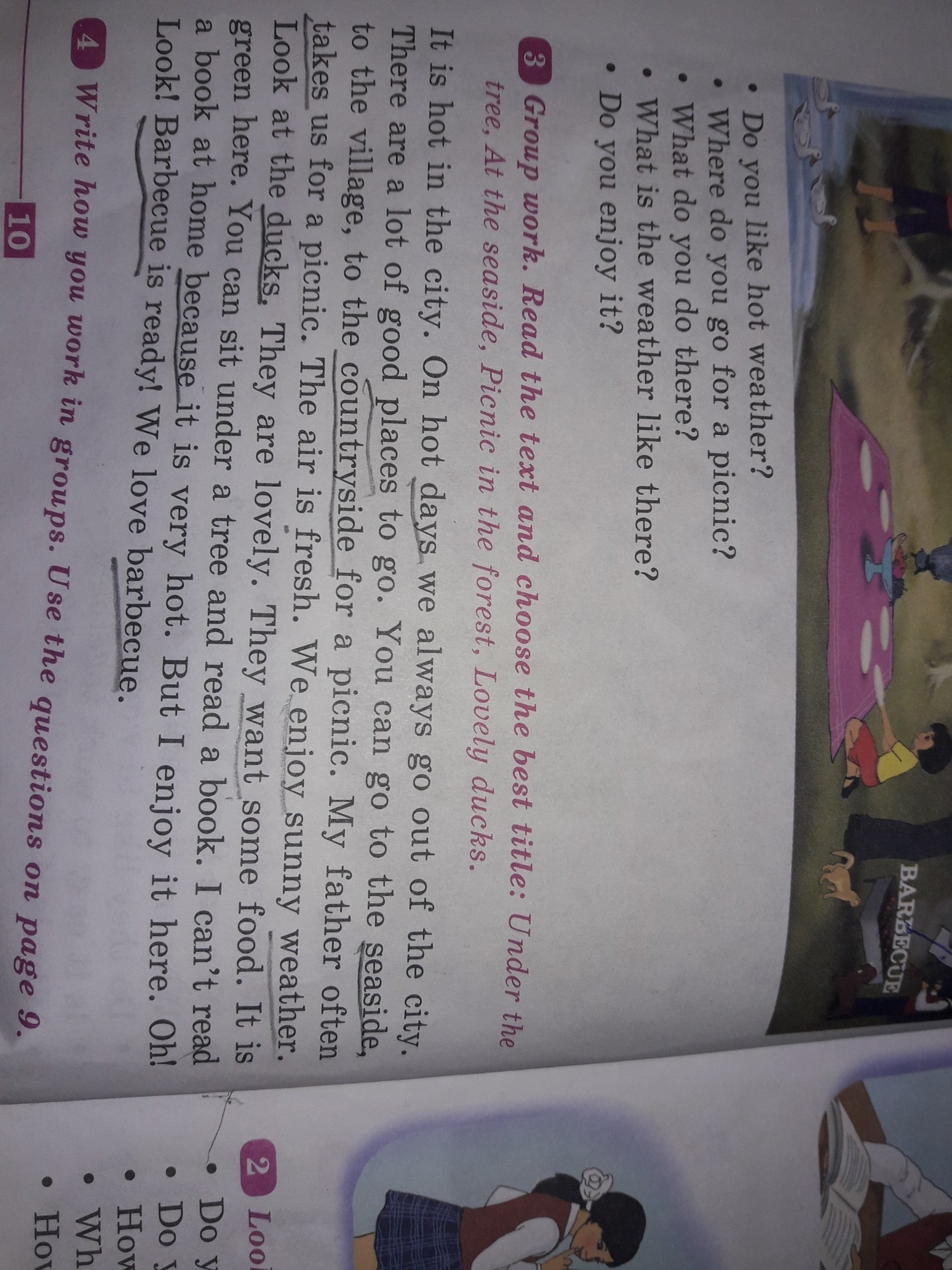 В городе жарко. В жаркие дни мы часто выезжаем загород. Существует много мест, в которые можно поехать. Ты можешь поехать на море, в деревню, село или на пикник. Мой папа часто берёт нас на пикник. Воздух свежий. Мы наслаждаемся солнечной погодой. Смотрим на уточек. Они милые. Они хотят кушать. Здесь все зелёное. Ты можешь сидеть под деревом читать книгу. Я не могу читать книгу дома потому что жарко. Но я наслаждаюсь здесь. Оу! Посмотрите! Барбекю готово! Мы любим барбекю