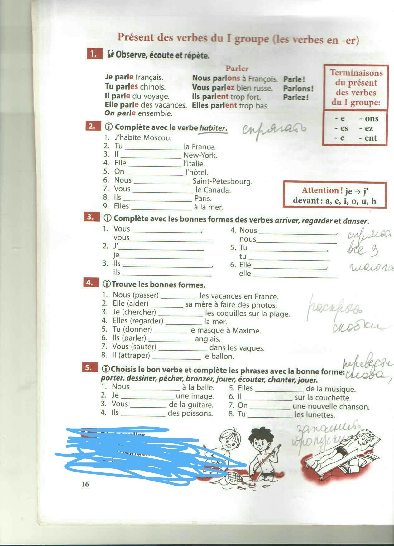 5. Choisis le bon verbe et complète les phrases avec la bonne forme: porter, dessiner, pêcher, bronzer, jouer, écouter, chanter, jouer.