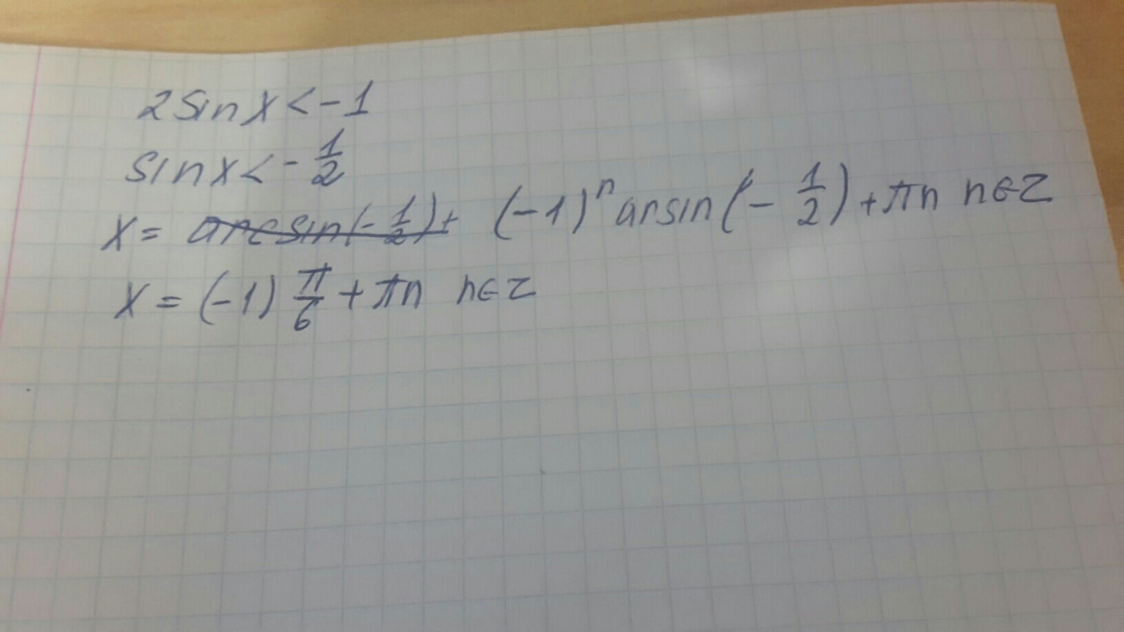 Решение : 2sin(x) < - 1 ⇔ sin(x) < - 1 / 2 * * * π+π/6 < x < 2π -π/6 * * *
