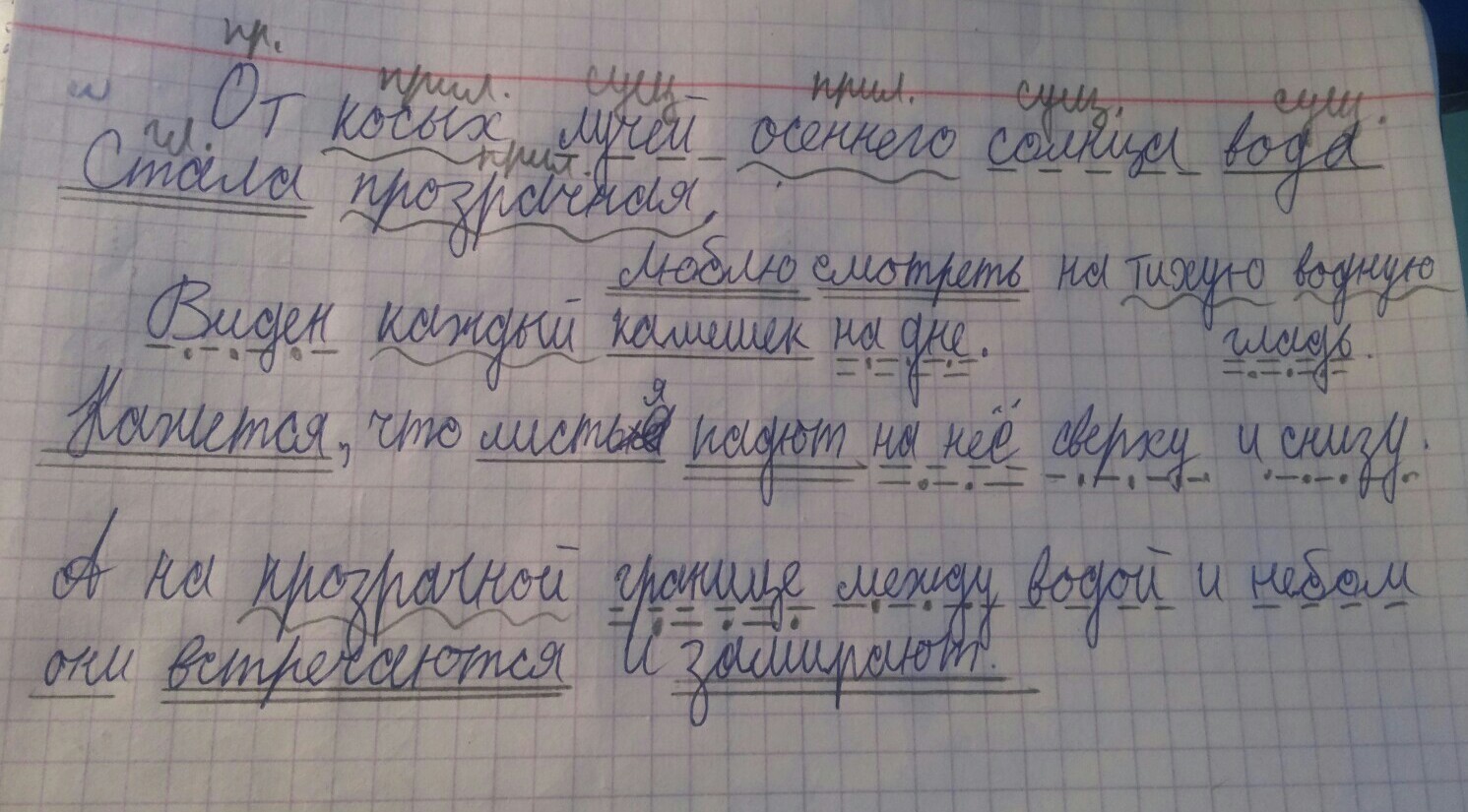 От косых лучей осеннего солнца вода стала прозрачная. Виден каждый камешек на дне . Люблю смотреть на тихую водную гладь . Кажеться что листья падают на нее сверху и снизу . А на прозрачной границе между водой и небом они встречаются и замирают. ( разобрать по членам предложения )