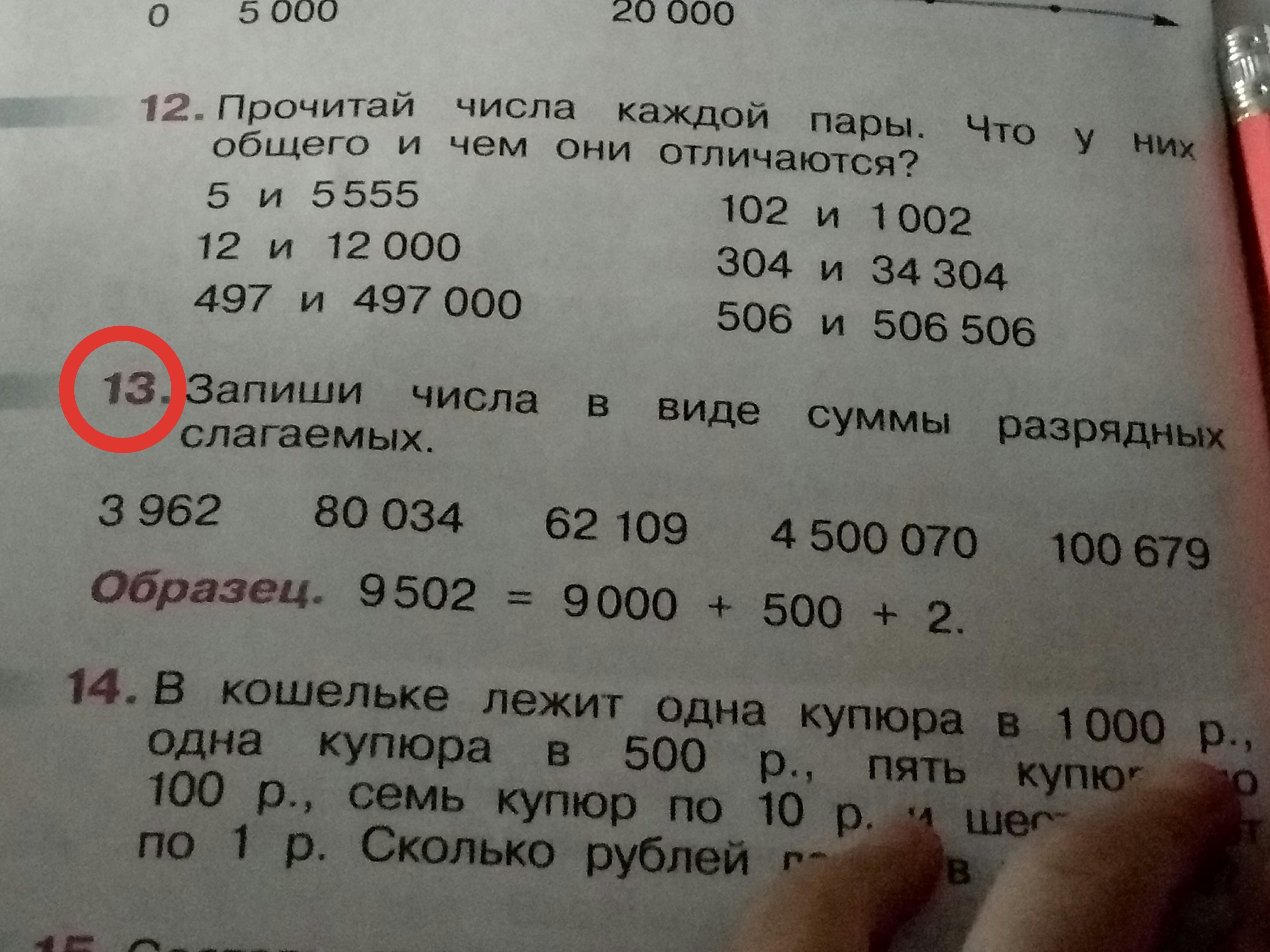 Первое 3000+900+60+2 Второе 80000+30+4 Третье 60000+2000+100+9 Четвёртое 4000000+500000+70 Пятое 100000+600+70+9