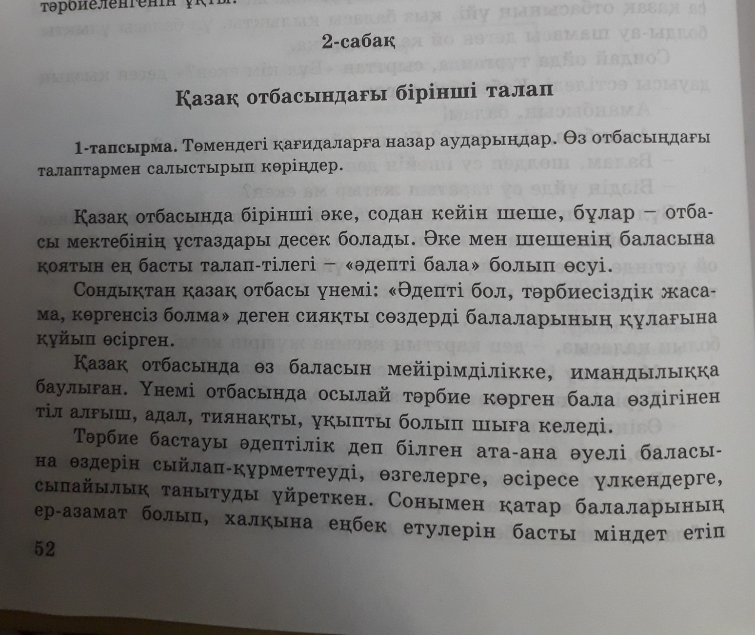 В казахской семье всегда глава отец, потом идёт Мама, они в семье как учителя. Папа и мама всегда учат детей быть воспитанными. Поэтому в казахских семьях всегда хотят что бы дети были воспитанными культурными и вели себя хорошо, и всегда заговорят об этом. В казахских семьях всегда говорят детям что бы они всегда были благодарны и морально воспитаны. И дети которые следует этим правилам растут послушными, честными устойчивыми аккуратными. дети которые растут воспитанными уважают родителей, особенно что бы они уважали старших. Учат детей быть хорошим человеком, быть трудолюбивым человеком своей страны. В семье спокойствие и изобилие зависит от женщины