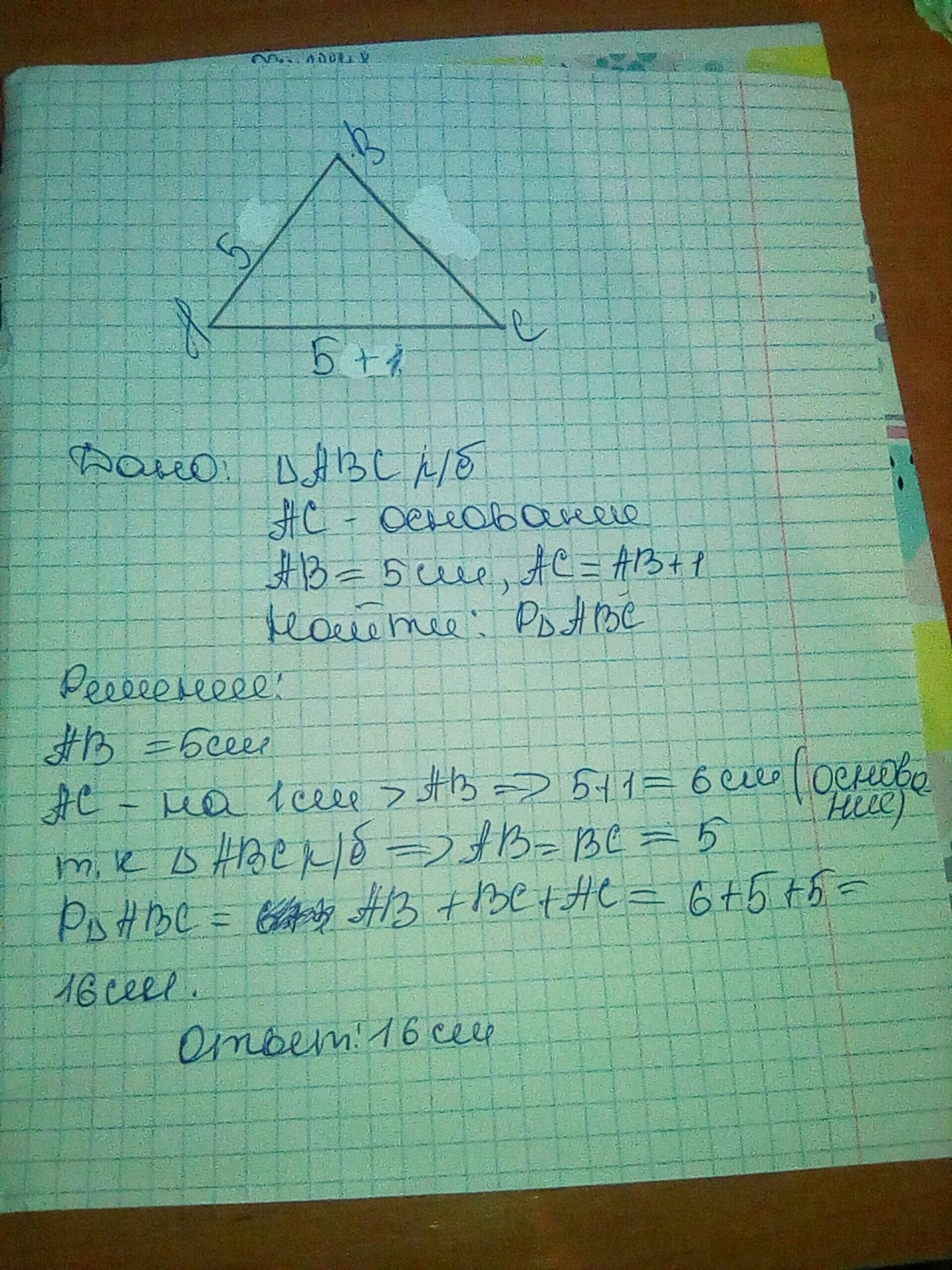 В равнобедренном треугольнике ABC с основанием AC сторона AB равна 5 см, длина стороны AC на 1 см больше длины стороны AB. Нужно найти периметр