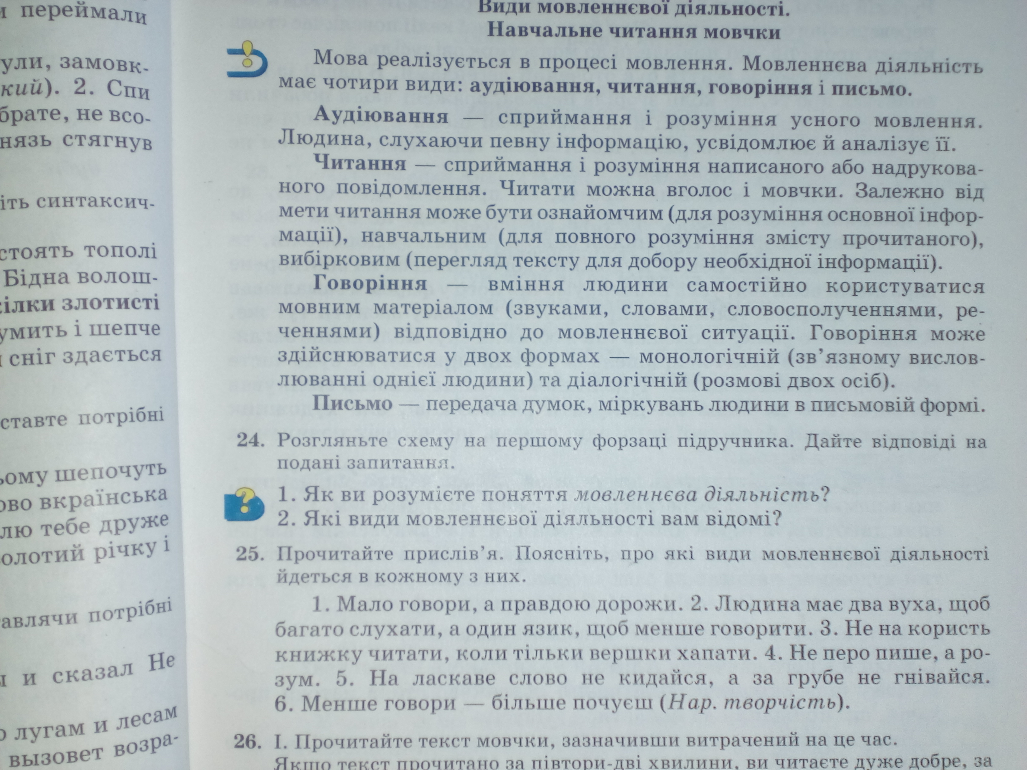 1.Говоріння,2. Слухання і говоріння ,3 Читання,4.Письмо,5.Слухання ,6.Говоріння і слухання