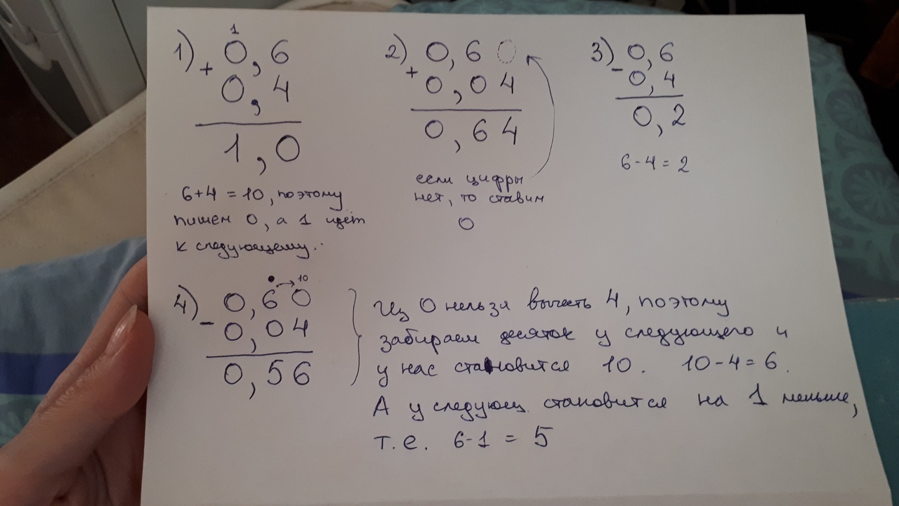 При вычитании тоже запятая под запятой, если не хватает, чтобы вычесть из одного числа другое (например из 5 надо вычесть 8), то занимается десяток у следующей цифры и тогда вы вычитаете уж из 15. А у следующей цифры остается просто на 1 меньше.