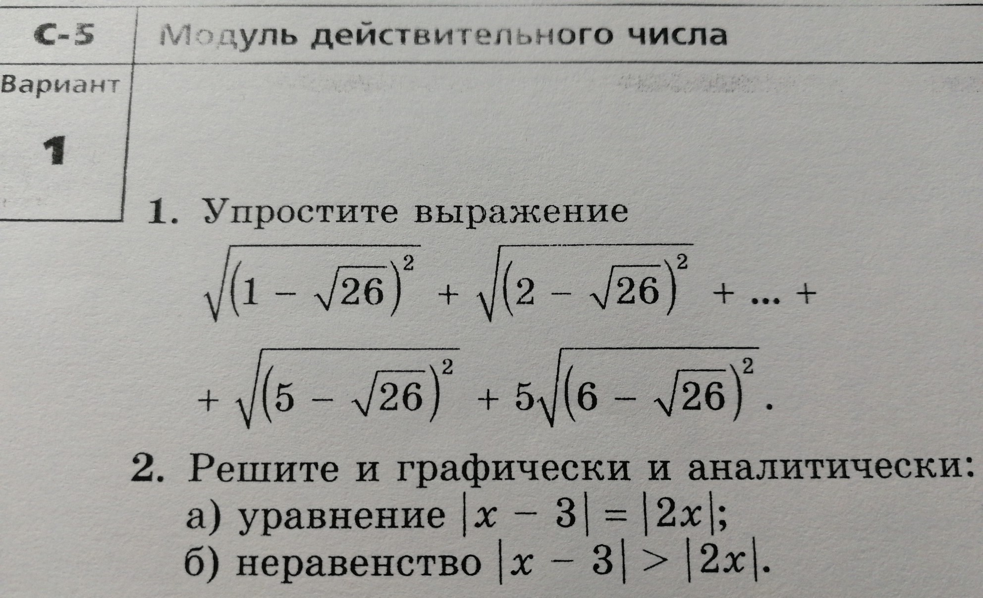 известна формула: V(x^2) = |x| 1)...= |1-V26|+|2-V26|+|3-V26|+|4-V26|+|5-V26|+5*|6-V26| = V26 - 1+V26 - 2+V26 - 3+V26 - 4+V26 - 5+5*6 - 5V26 = 30-15 = 15 2a) или х-3=2х или х-3=-2х х=-3 или х=1 2б) можно по-разному решать... например, так: V(x-3)^2 > V(2x)^2 x^2 - 6x + 9 > 4x^2 x^2 + 2x - 3 < 0 ---> x э (-3; 1)