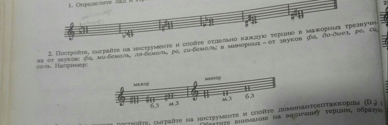 Привет В этом примере надо строить от заданной ноты трезвучие, например мажор от ноты Фа. Мажорное (большое) трезвучие — трезвучие, состоящее из большой терции внизу и малой — вверху, вот и получается у нас фа - ля - до. Где фа-ля это большая терция, а ля-до малая терция. И обозначается б.3 Минорное трезвучие — трезвучие, состоящее из малой терции внизу и большой — вверху. Нам надо построить от ноты фа минорное трезвучие. фа-ляb -до . Где фа-ляb малая терция (м.3), а ляb-до большая терция (б.3)