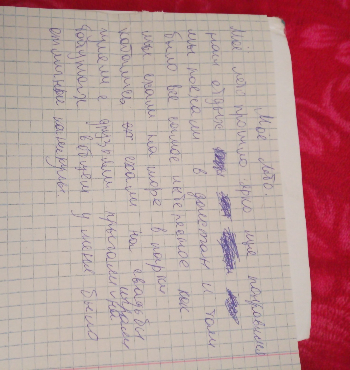 Моё лето прошло ярко, мне понравился наш отдых, мы поехали в (... не понимаю это слово), и там было всё самое интересное. Так же мы ездили на море и в парки, катались на велосипедах, ездили на свадьбу, где было очень весело. Благодаря лету мы часто виделись с друзьями и веселились вместе. Особенно мне запомнился момент когда мы прыгали на батутах, как мне казалось это было достаточно высоко, что придавало веселья и остроты ощущениям. Я рад за время, проведенное летом.