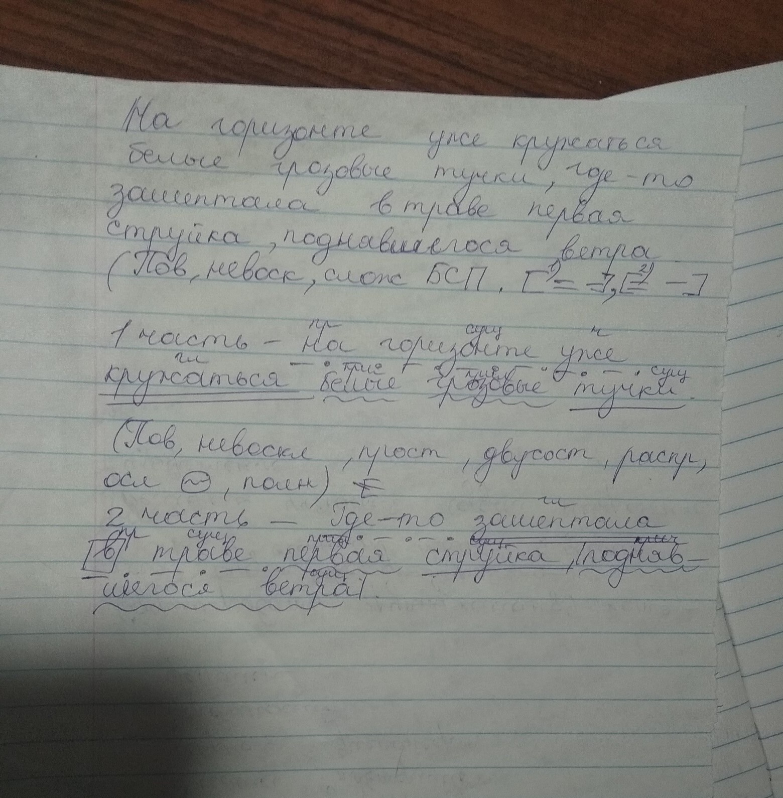 Сделайте синтаксический разбор сложного предложения на горизонте уже кружатся белые грозовые тучки где-то зашептала в траве первая струйка поднявшегося ветра ...