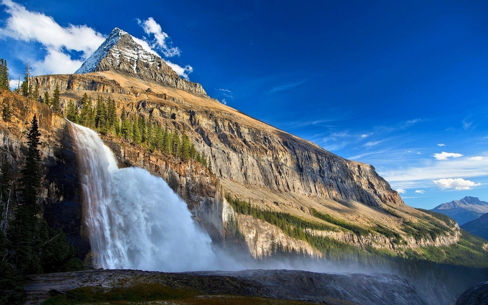 These are magnificent mountains. They are very high and they have a waterfall. In the mountains grow coniferous trees. These mountains with very steep slopes. They are like pyramids, the same triangular. Perhaps there is a spectacular view.