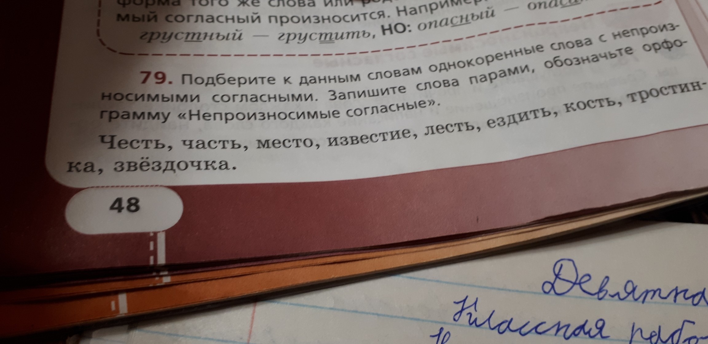 Честь-честный, часть-частный, место-местный, известие-известный, лесть-прелестный, ездить-разъезжать, кость-костный, тростинка-тростник, звёздочка-звёздный.