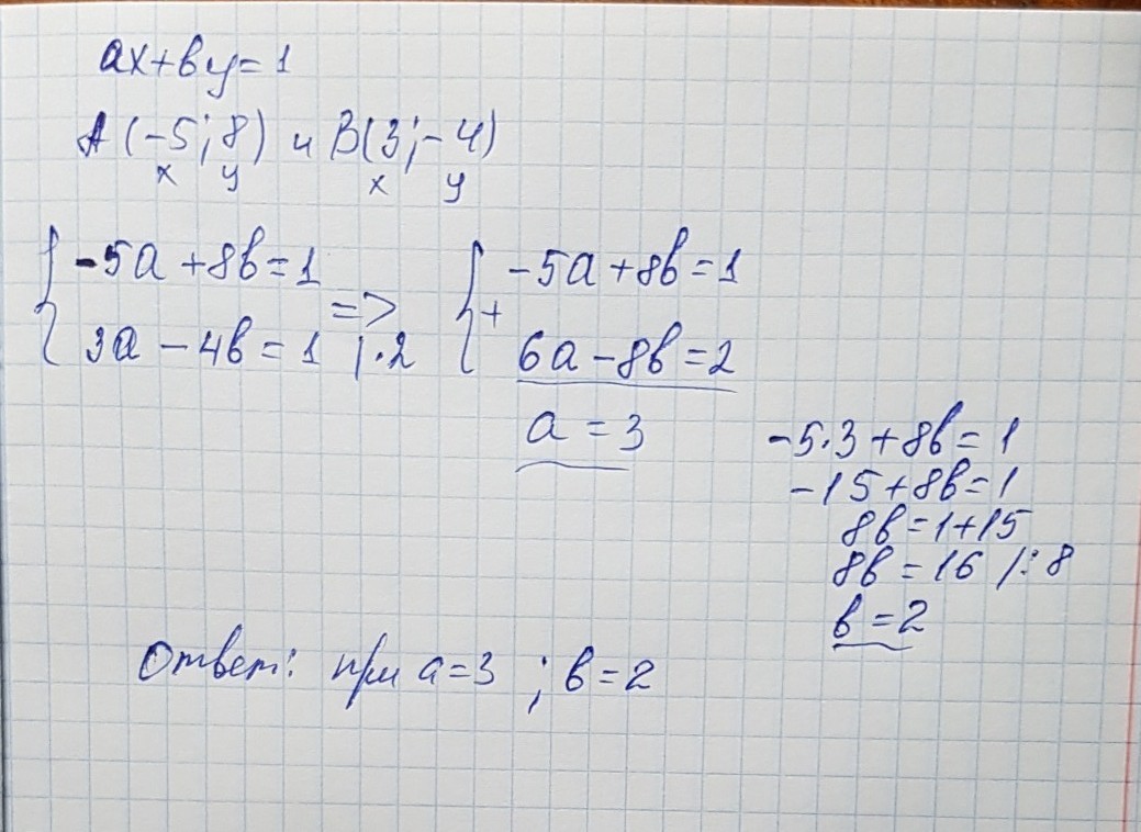 При каких значениях a и b прямая ax+by=1 проходит через точки A(-5;8) и B(3;-4)?