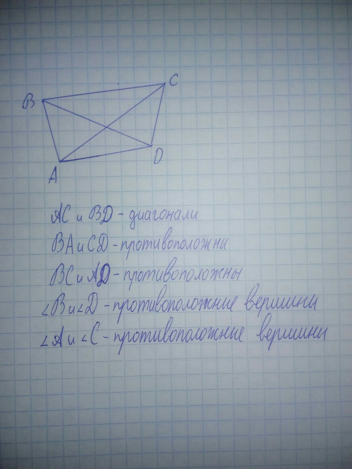 Начертите четырехугольник и покажите Его диагонали противоположные стороны и противоположные вершины