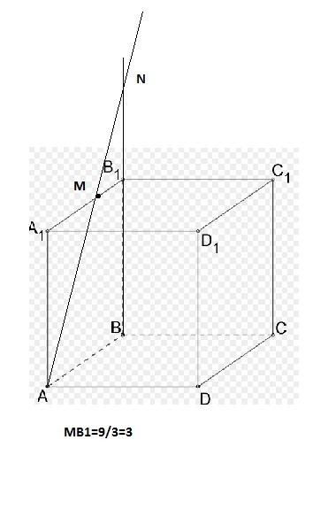 В кубі точка М лежить на ребрі А1В1, причому МВ1=1/3(дробь)А1В1, точка N перет. прямої АМ з площиною грані ВВ1С1С. Зн. довжину відрізка В1N, якщо ребро куба 9 см
