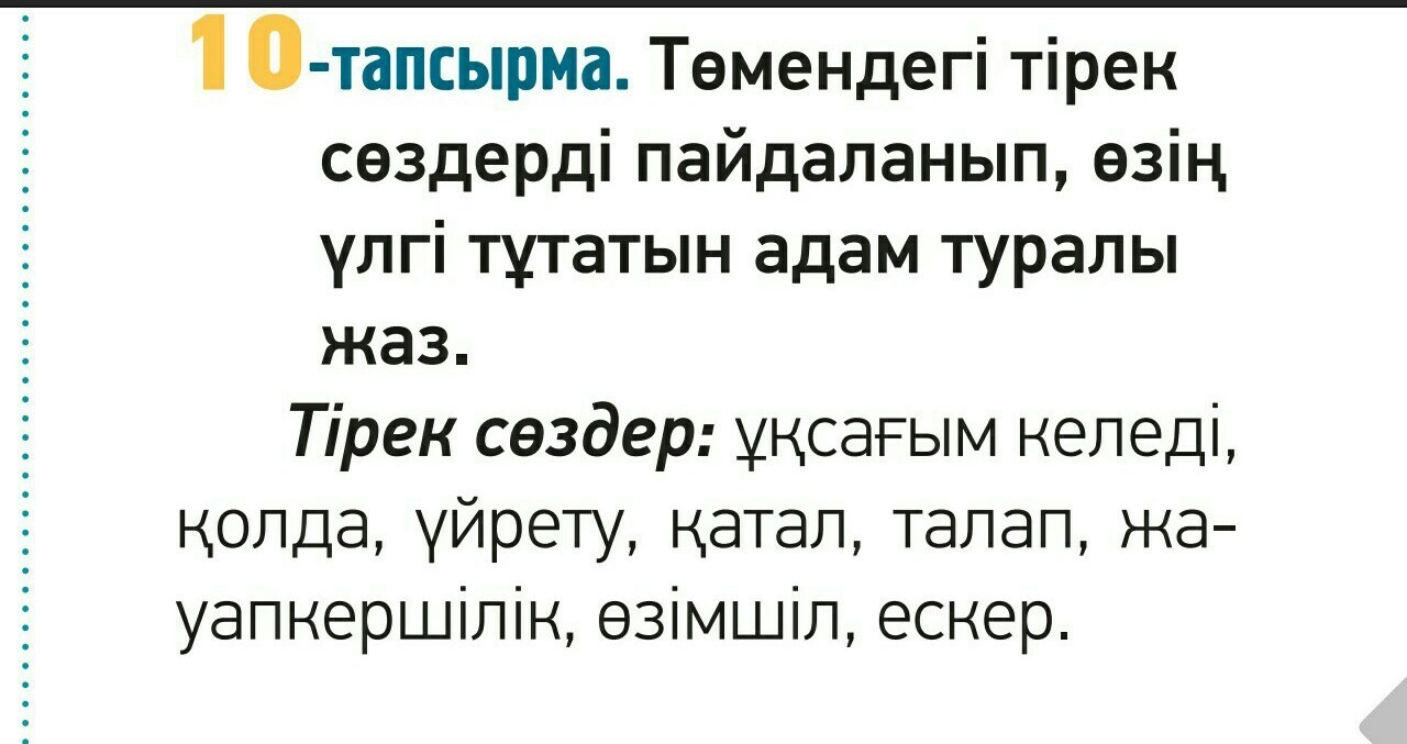 Мысалы: Мен Нұрсұлтан ұстаным келеді. Оның қолын да үйренген келеді. Тіпті қатал болса да, алдыма қойған талаппен жүремін.Оның маған берген әр тапсырмасын жауапкершілікпен қараймын.Әр сөзін ескеретін.