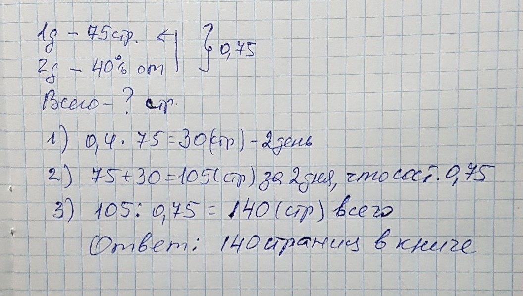 даша прочитала в 1 день 75 страниц книги, во 2 день 40% прочитаного в 1 день. Сколько всего страниц в книге, если за два дня даша прочитала 0,75 книги?