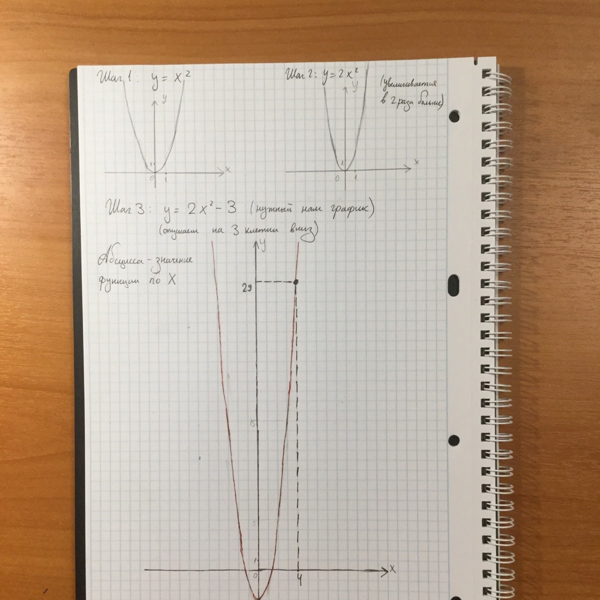 определите значение функции y=2x^2-3 в точке с абсциссой 4. Пишите ответ подробно с графиком функции!!!
