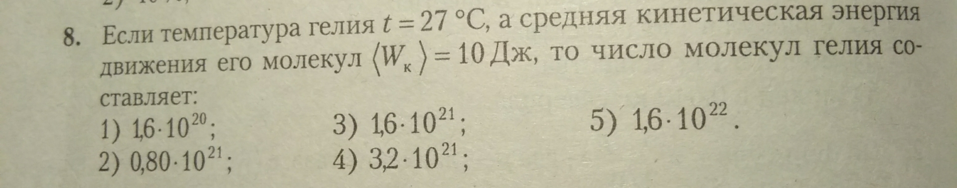 E1=3*k*T/2 W=N*E1 N=2*W/3*k*T=2*10/3*1,38*10^-23*300=1,6*10^21 Ответ 3)