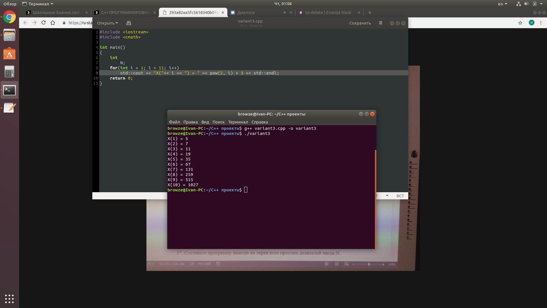 1. В С++ составьте программу вычисления первых 10 членов последовательности, заданной формулами n-го члена x(n)=2^n+3.