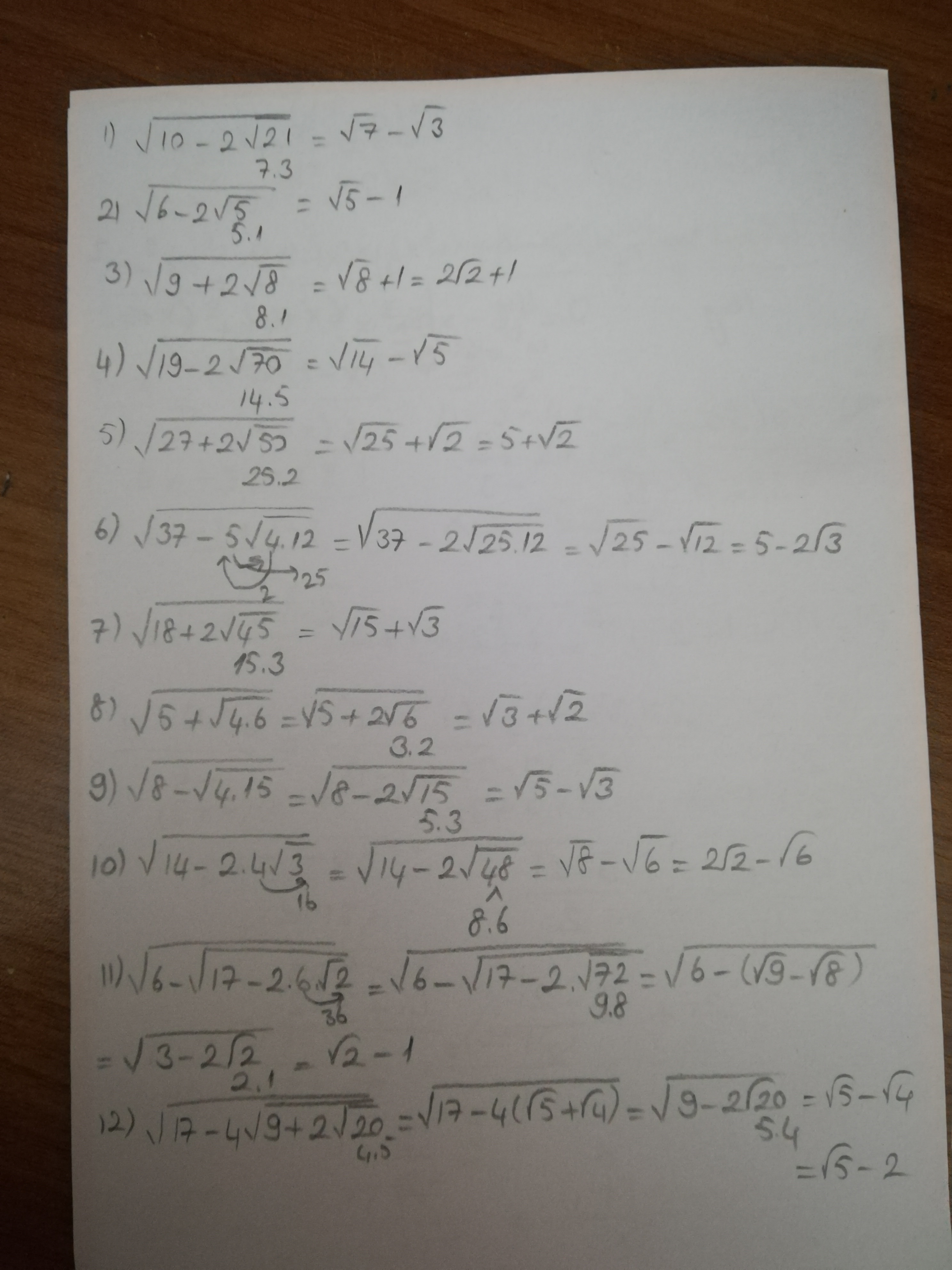 √(10 - 2√21) =√(7 - 2√7*√3 +3) =√(√7 - √3 )² = √7 - √3 .