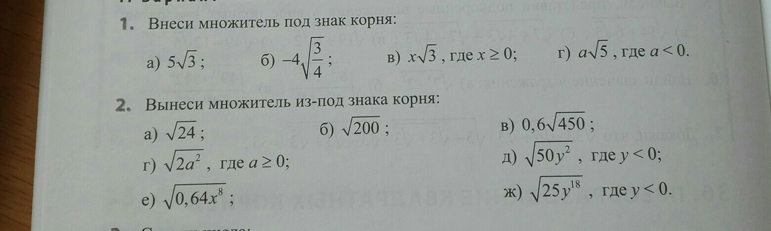 г) а√5= - √5а² (т.к. а меньше 0, значит когда мы внесем его под корень, наше число станет отрицательным, поэтому впереди ставим минус )