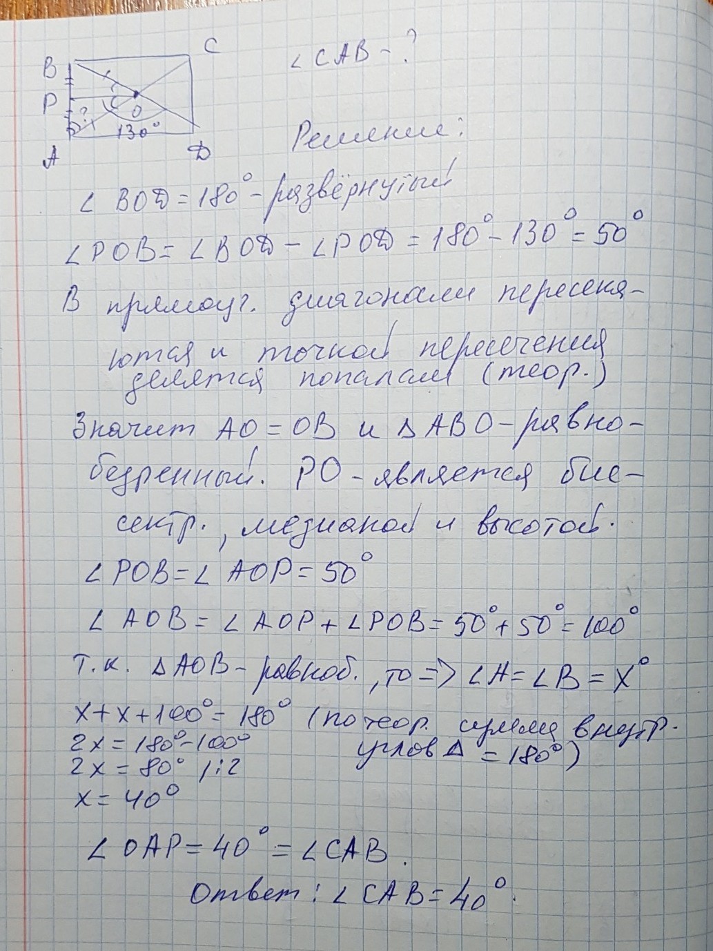 В прямоугольнике АВСD диагонали пересекаются в точке О. ОР - биссектриса треугольника АОВ, угол DOP равен 130 °. Найдите градусную меру угла САВ.