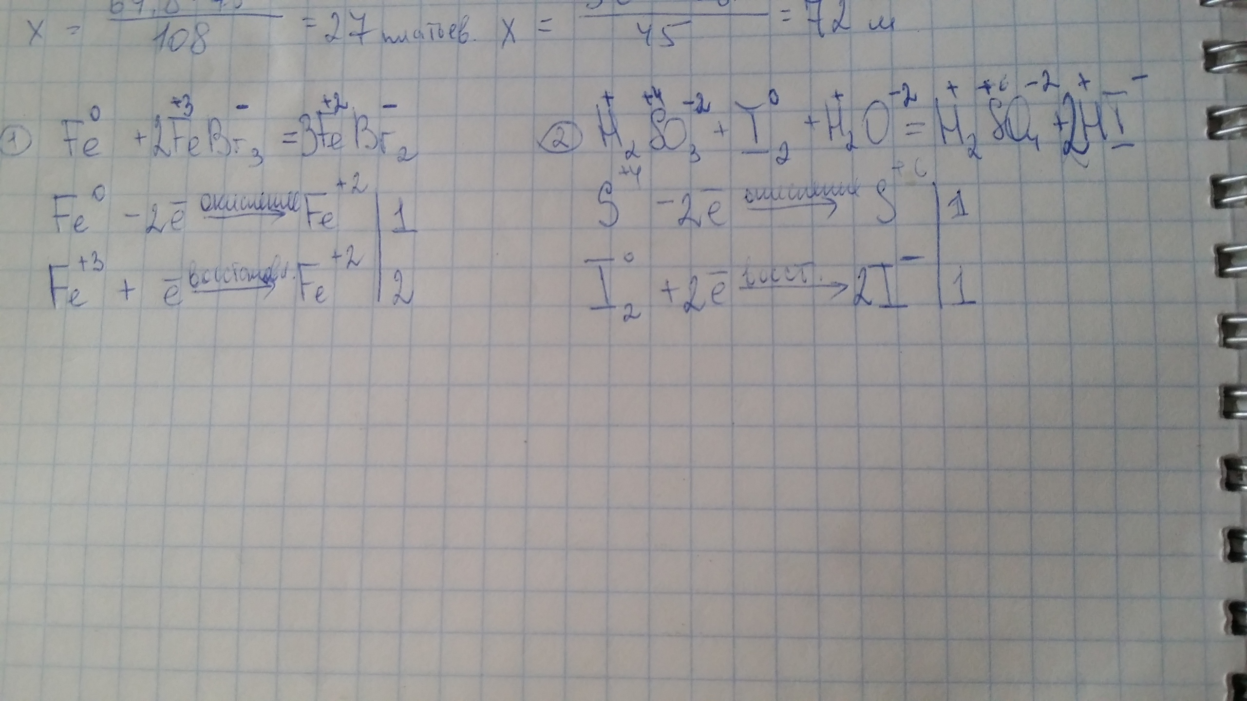 Проставить степень окисления каждого элемента и расставить коэффициенты, используя метод электронного баланса: 1) Fe+FeBr3=FeBr2 2) H2SO3+I2+H2O=H2SO4+HI