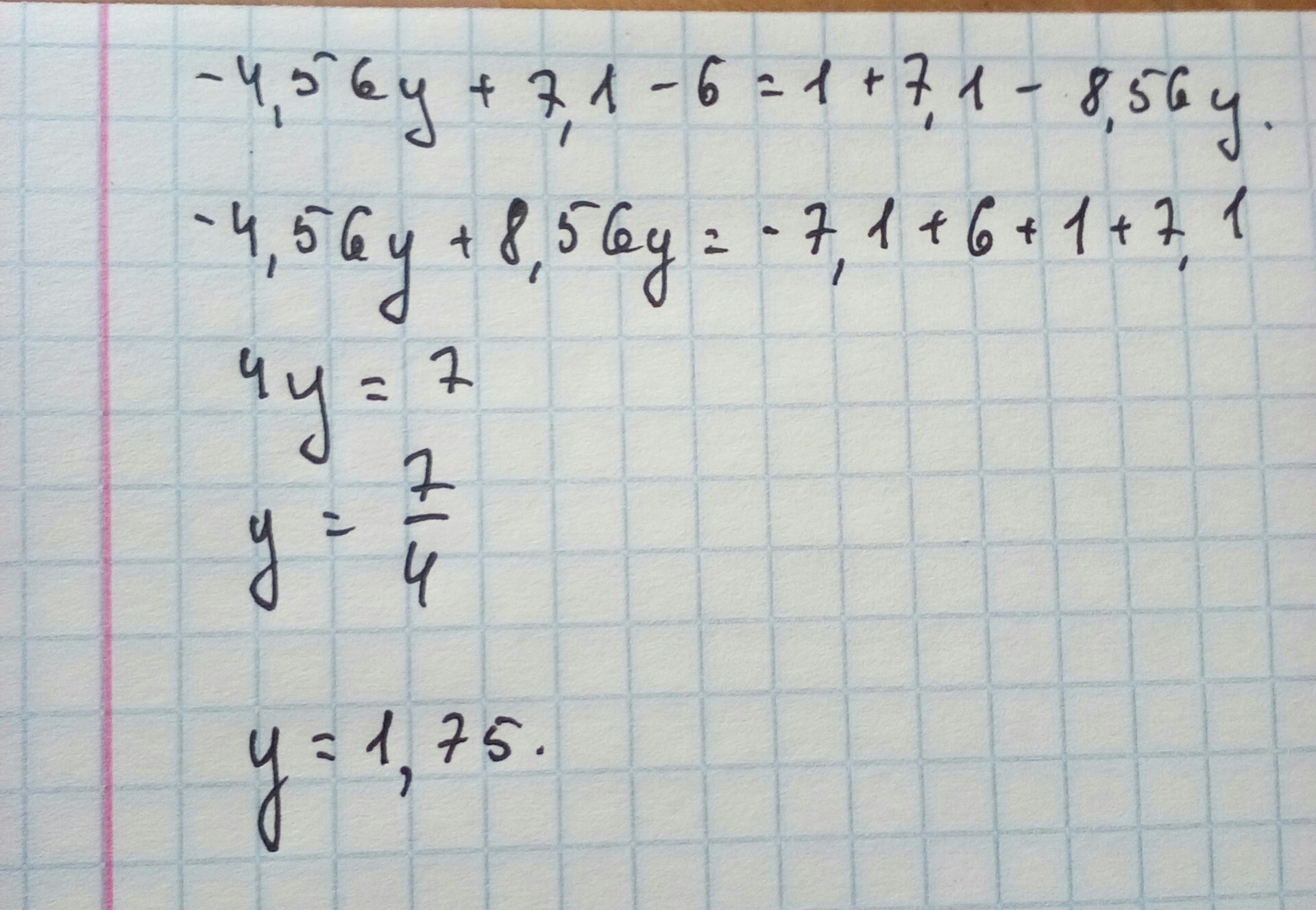 -4,56y+(7,1-6)=1+7,1-8,56y 1,1-1-7,1=-8,56y+4,56y -7=-4y y=7:4 y=1,75 Проверяем -4,56×1,75+(7,1-6)=1+7,1-8,56×1,75 -6,88=-6,88