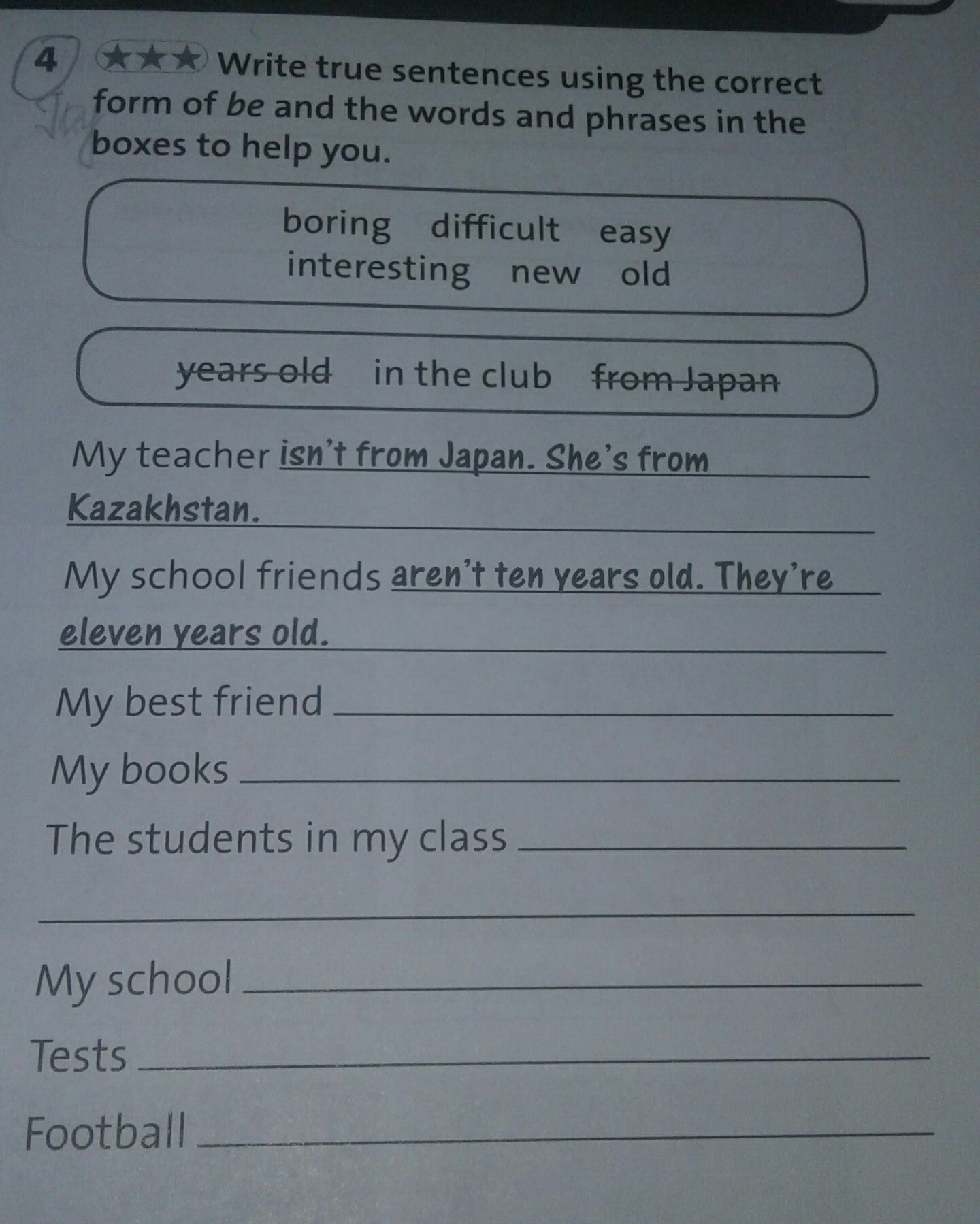 My best friend isn't in the club. He is at home. My books aren't boring. They are interesting. The students in my class aren't new. The are old. My school isn't old. It's new. Tests aren't difficult. They are easy. Football isn't boring. It's interesting.