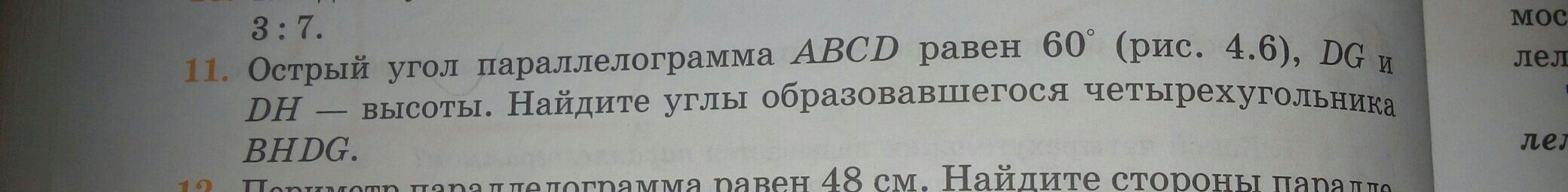 Тупой угол параллелограма равен 180-60=120 - это угол GBH (угол В) четырехугольника BHDG. Тогда остальные углы этого четырехугольника равны: H=G=90 (поскольку DH и DG высоты) D=360-90-90-120=60.