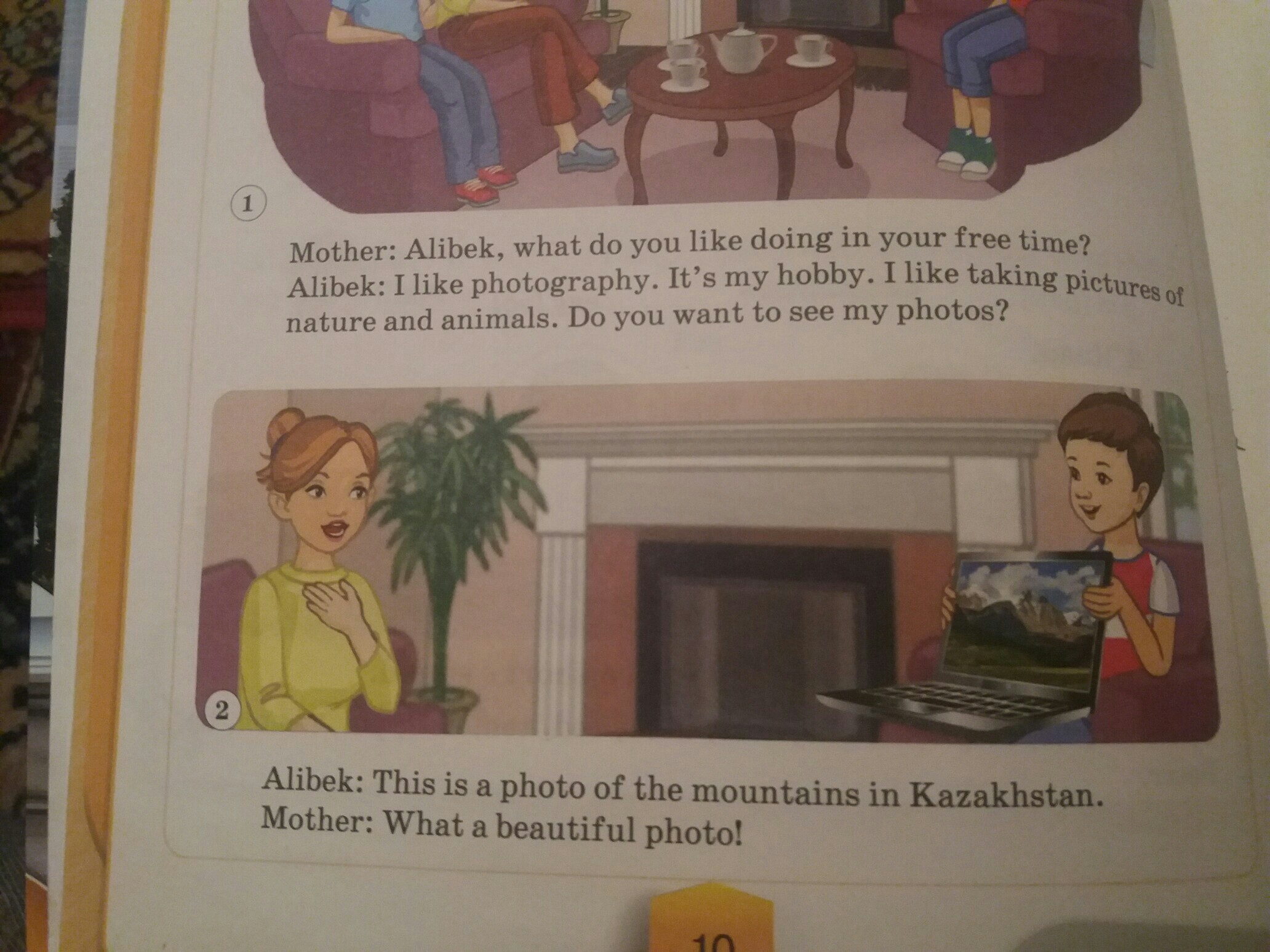 Мама:Альбек, что ты любишь делать в свободное время? Альбек:Я люблю фотографировать. Это моё хобби. Я люблю делать фотографии природы и животных. Хочешь посмотреть мои фотографии. Это фото гор Казахстана. Мама: это замечательное фото.