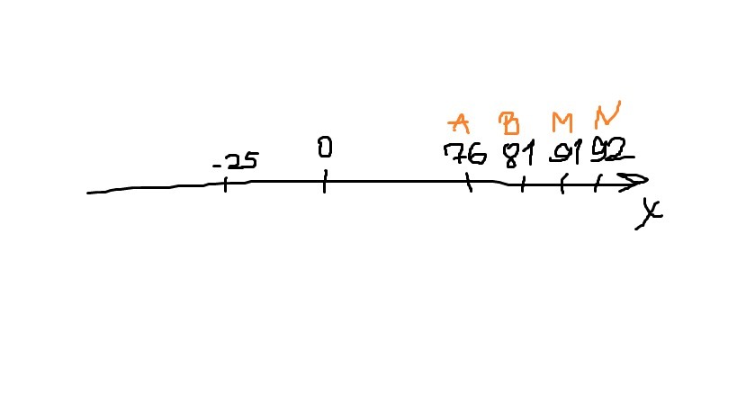 на числовой оси с точки отсчета О заданы А,В,М,иN. запишите координаты каких либо трех точек числовой оси, расположенных на расстоянии более, 100 единиц от точки - 25