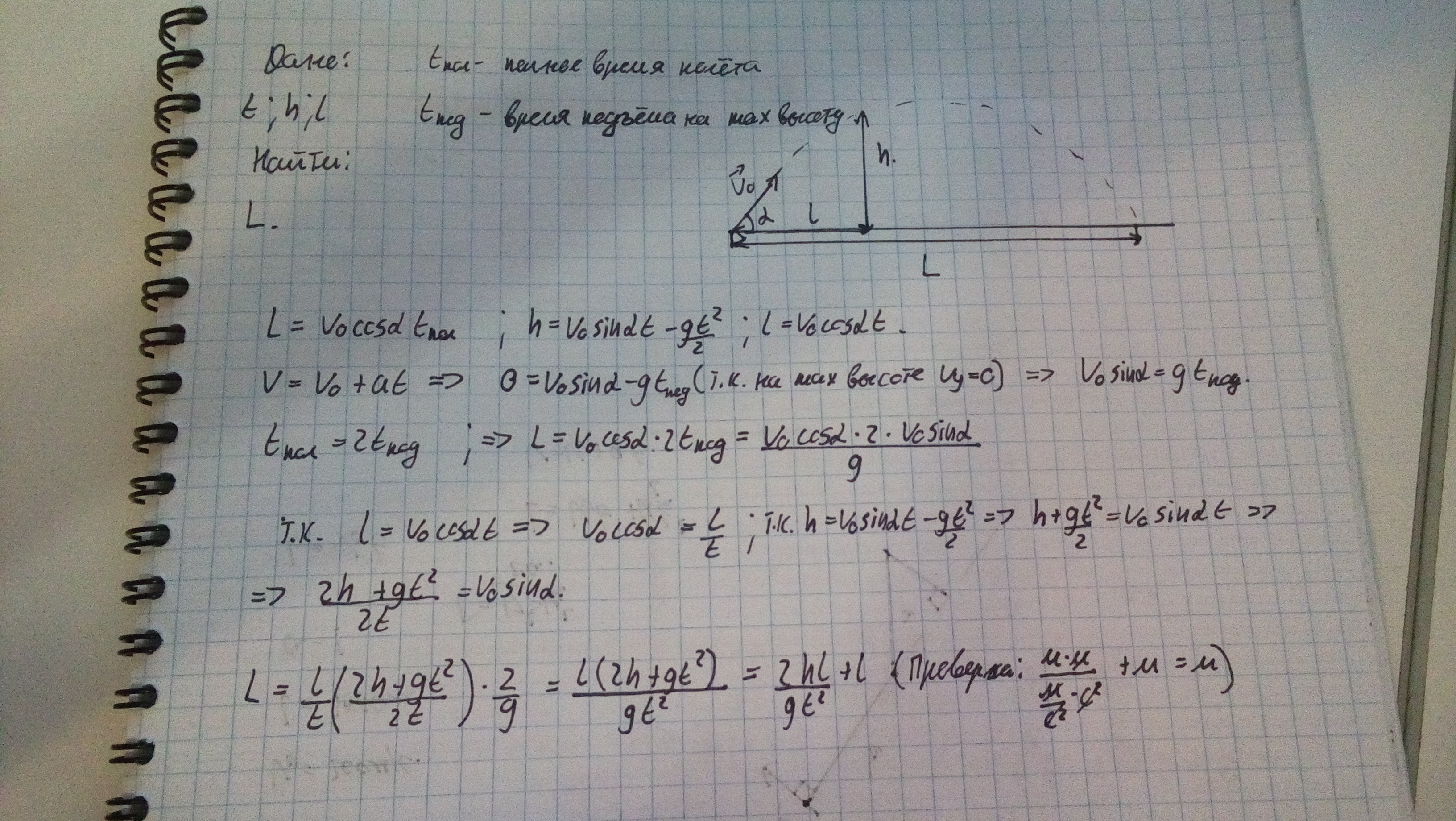 расстоянии l по горизонтали от пушки. Определите дальность L полета снаряда Точки старта и финиша лежат в одной горизонтальной плоскости.