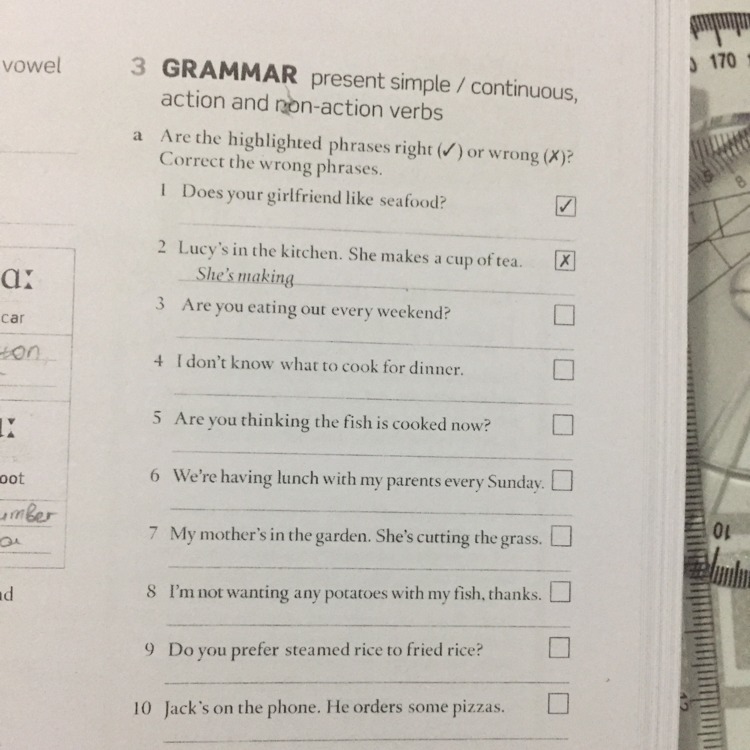 3 do you eat out every weekend? 4, 5 do you think about the fishes cooked now?6 we has lunch...7. 8 I don't want any potatoes... 9 10he is ordering...