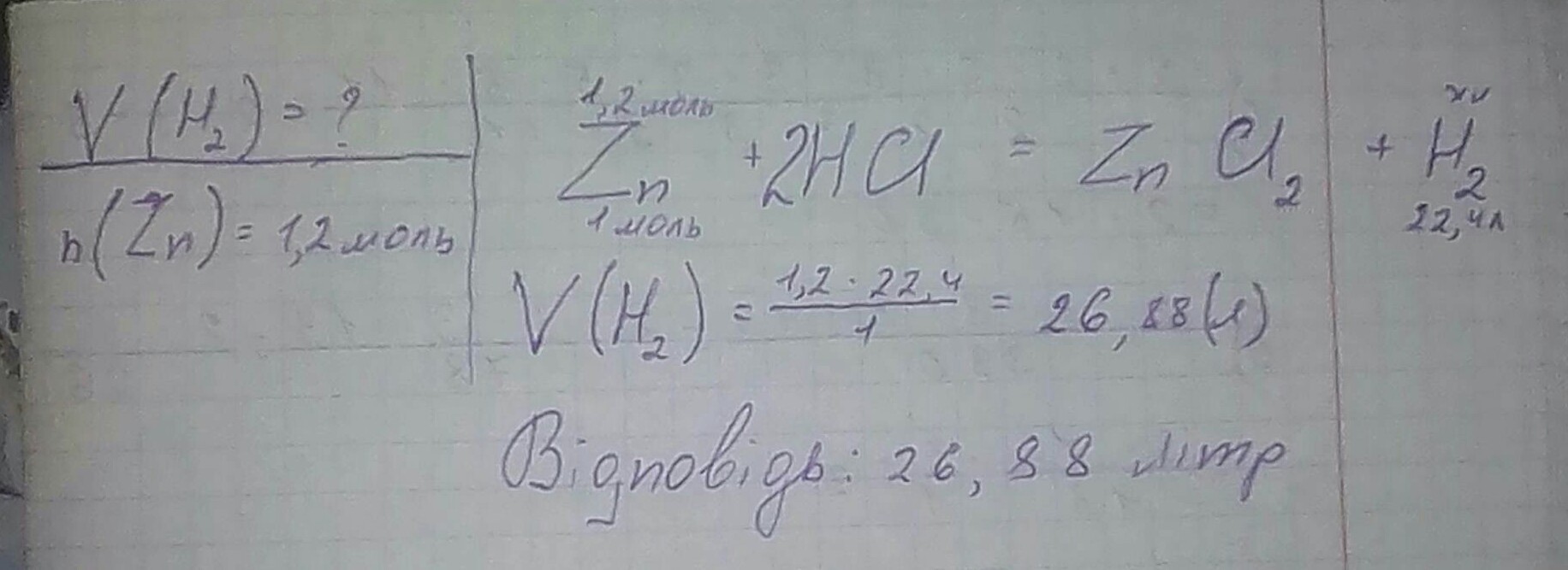 Обчисліть об'єм газу, що виділився під час взаємодії 1,2 моль цинку з хлоридною кислотою.