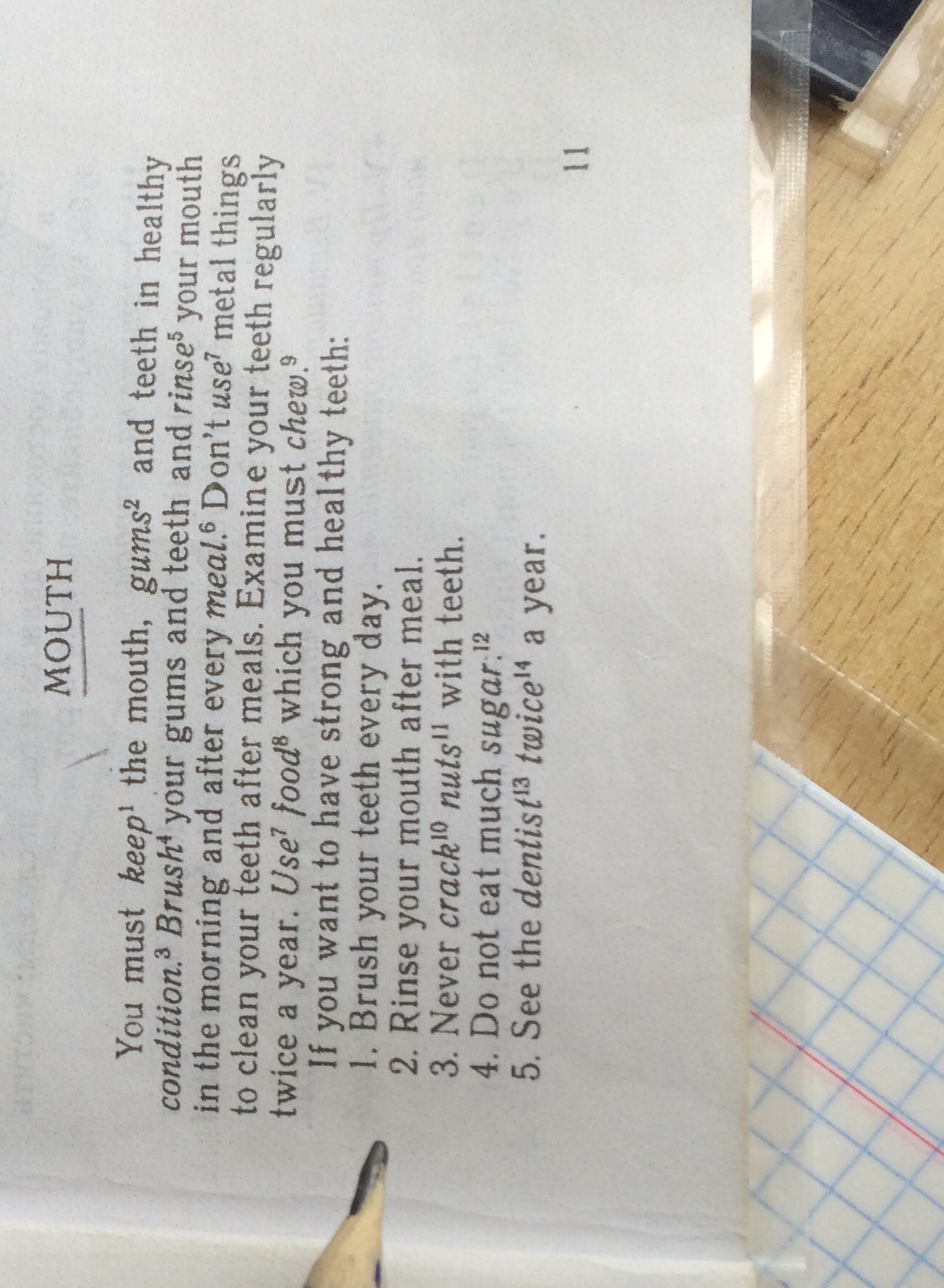 Ты должен поддерживать полость рта, десны и зубы в здоровом состоянии. Чисти свои дёсны и зубы, а также полоскай рот по утрам и после каждого приема пищи. Не используй металлические предметы, чтобы очистить зубы от остатков пищи. Дважды в год проверяй свои зубы (у врача). Кушай пищу, которую нужно пережевывать. Если ты хочешь иметь сильные и здоровые зубы (следуй этим правилам):