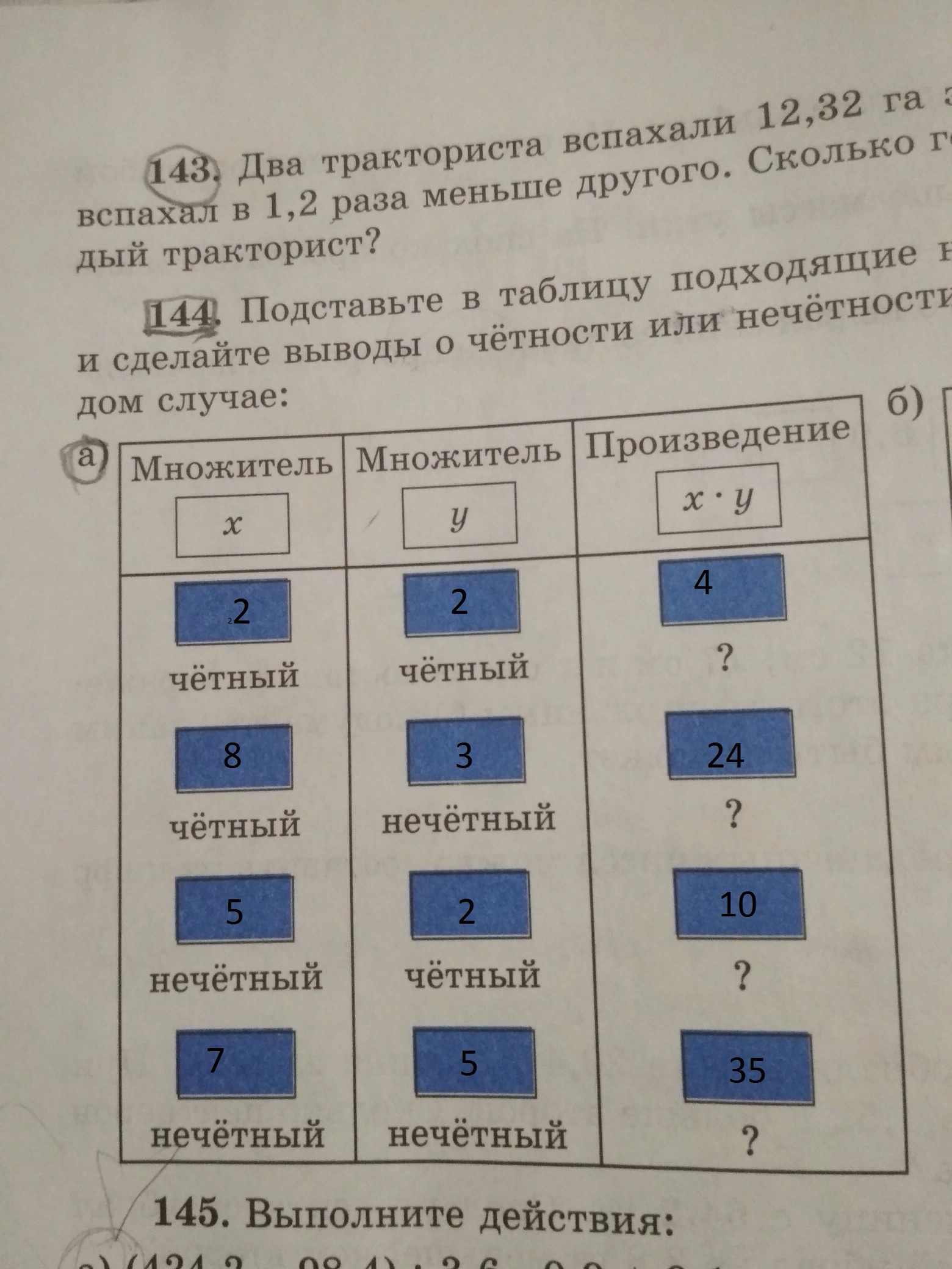 подставьте в таблицу подходящие натуральные значения x и y и сделайте выводы о четности или нечестности результата действия в каждом случае: множитель, множитель, произведение.
