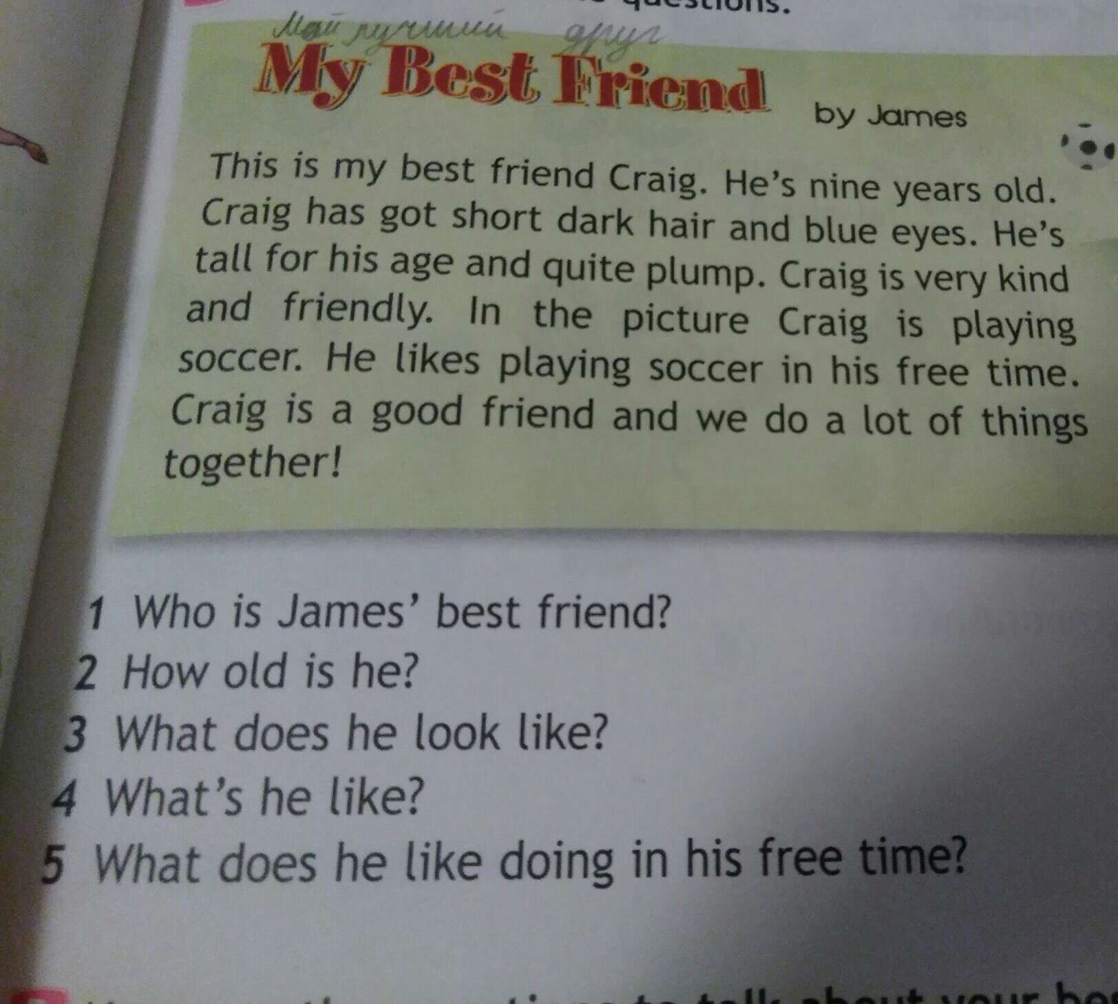 Это мой лучший друг Крейг. Ему девять лет. У Крейга короткие тёмные волосы и синие глаза. Он высокий для своего возраста и толстяк. Крейг добрый и дружелюбный. На картинке Крейг играет в футбол. Он любит играть в футбол в свободное время. Крейг хороший друг и мы делаем многое вместе.