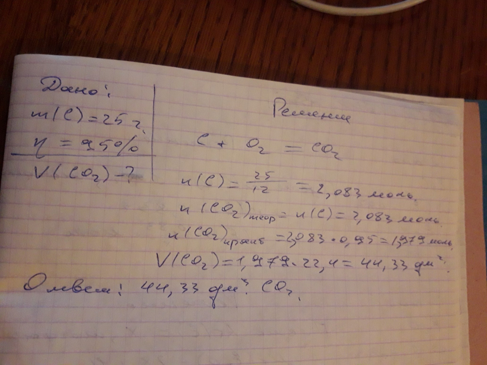 с кислородом вступает углерод, массой 25 грамм. определите объем образовавший оксид углерода 4 если выход продукта от теоритечески возможного сост. 95%