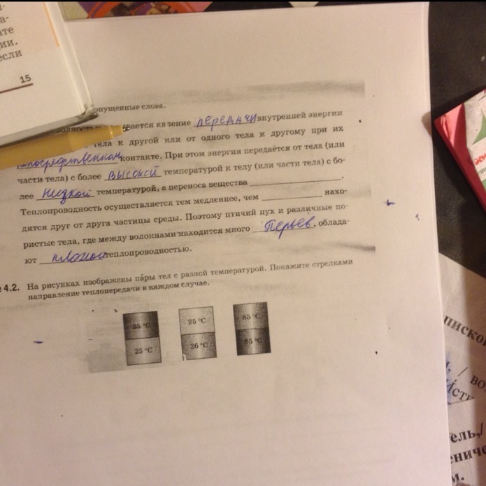 На рисунке изображены пары тел с разной температурой. Покажите стрелками направление теплопередачи в каждом случае.