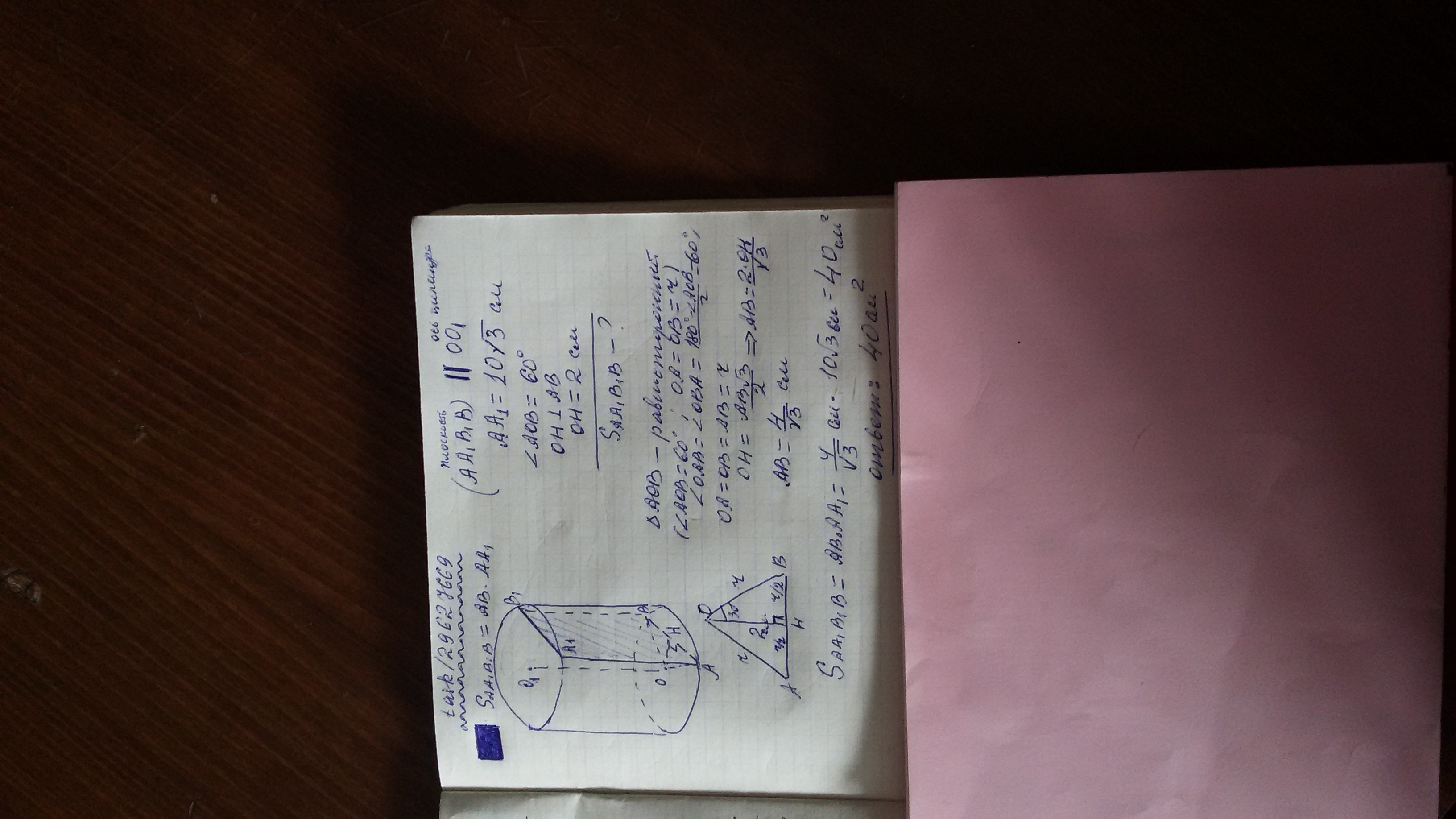 Плоскость, параллельная оси цилиндра, отсекает от окружности основания дугу в 60 градусов. Образующая цилиндра равна 10 корней из 3 см, расстояние от оси до секущей плоскости равно 2 см. Найдите площадь сечения.