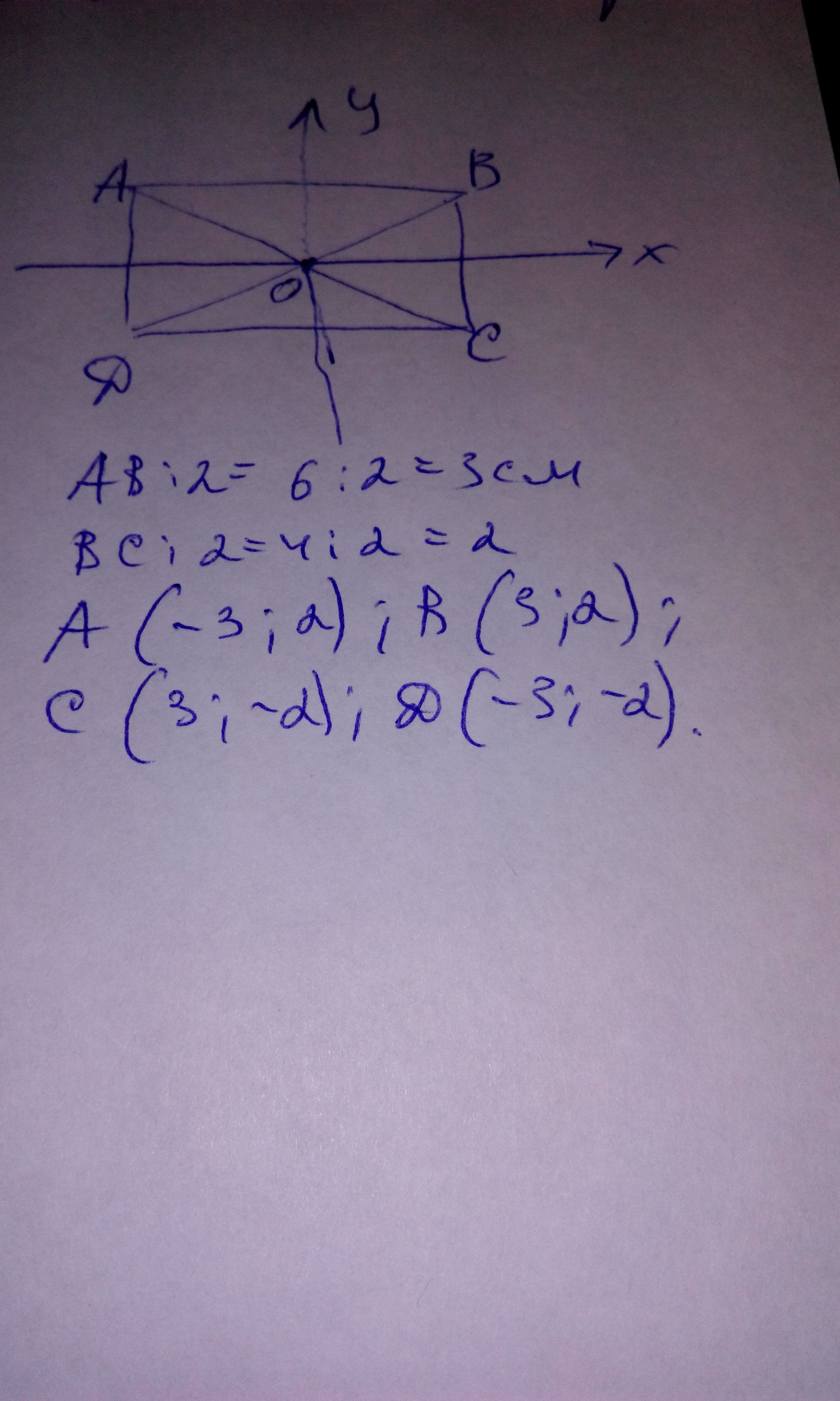 Найти координаты вершин прямоугольника со сторонами 4 и 6 см, если точка пересечения его диагоналей принята за начало координат, а стороны параллельны осям, причем большая сторона параллельна оси Ox.