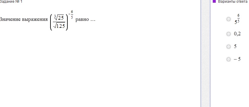 5^(2/3)*(-6/5)*5^(-3/2)(-(6/5))=5^(-4/5)*5^(9/5)=5^1=5
