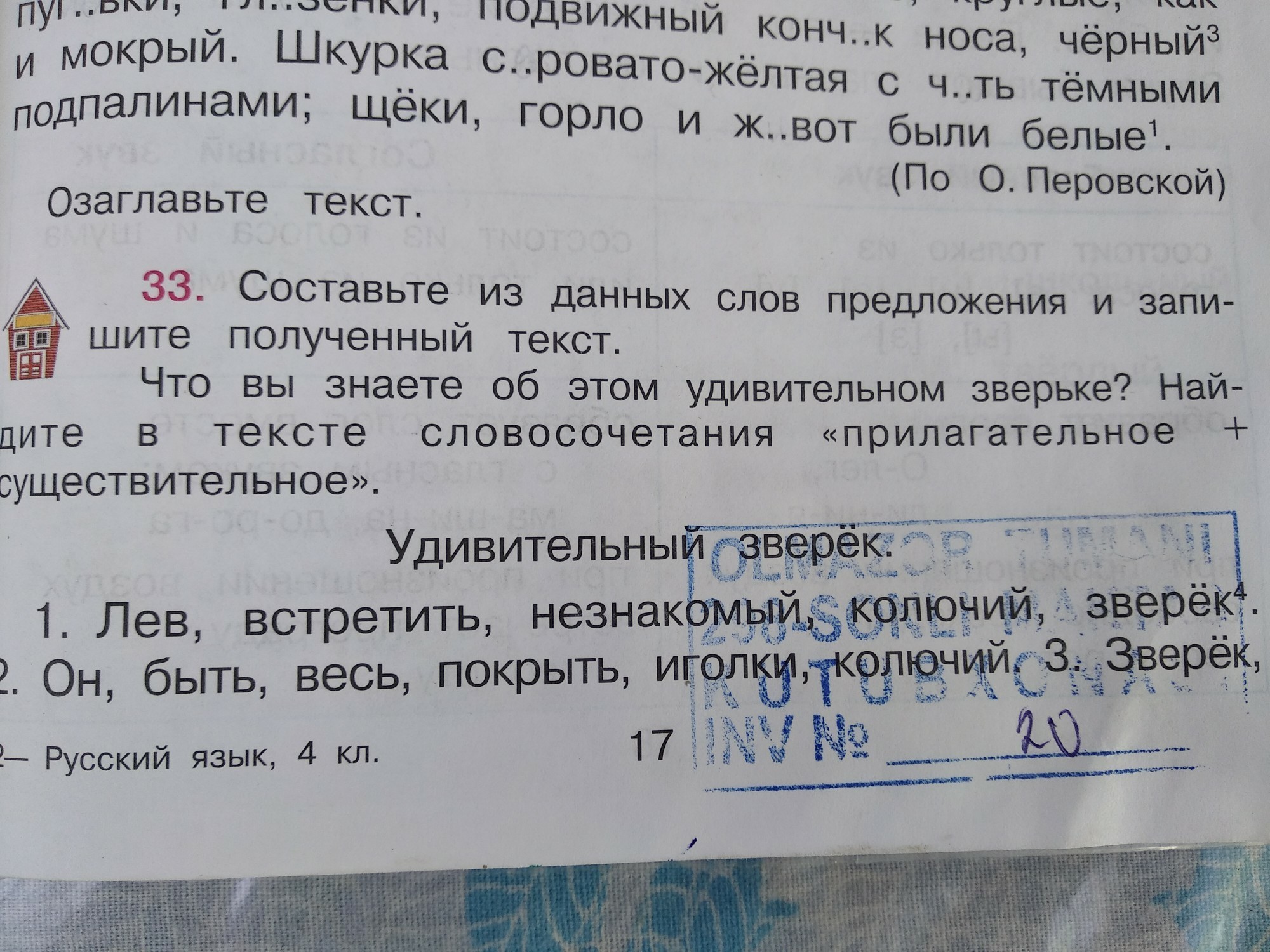 Лев встретил незнакомого, колючего зверька. Словосочетания: незнакомого зверка, колючего зверка; Он был весь покрыт колючими иголками. Слов-соч.: колючими иголками.