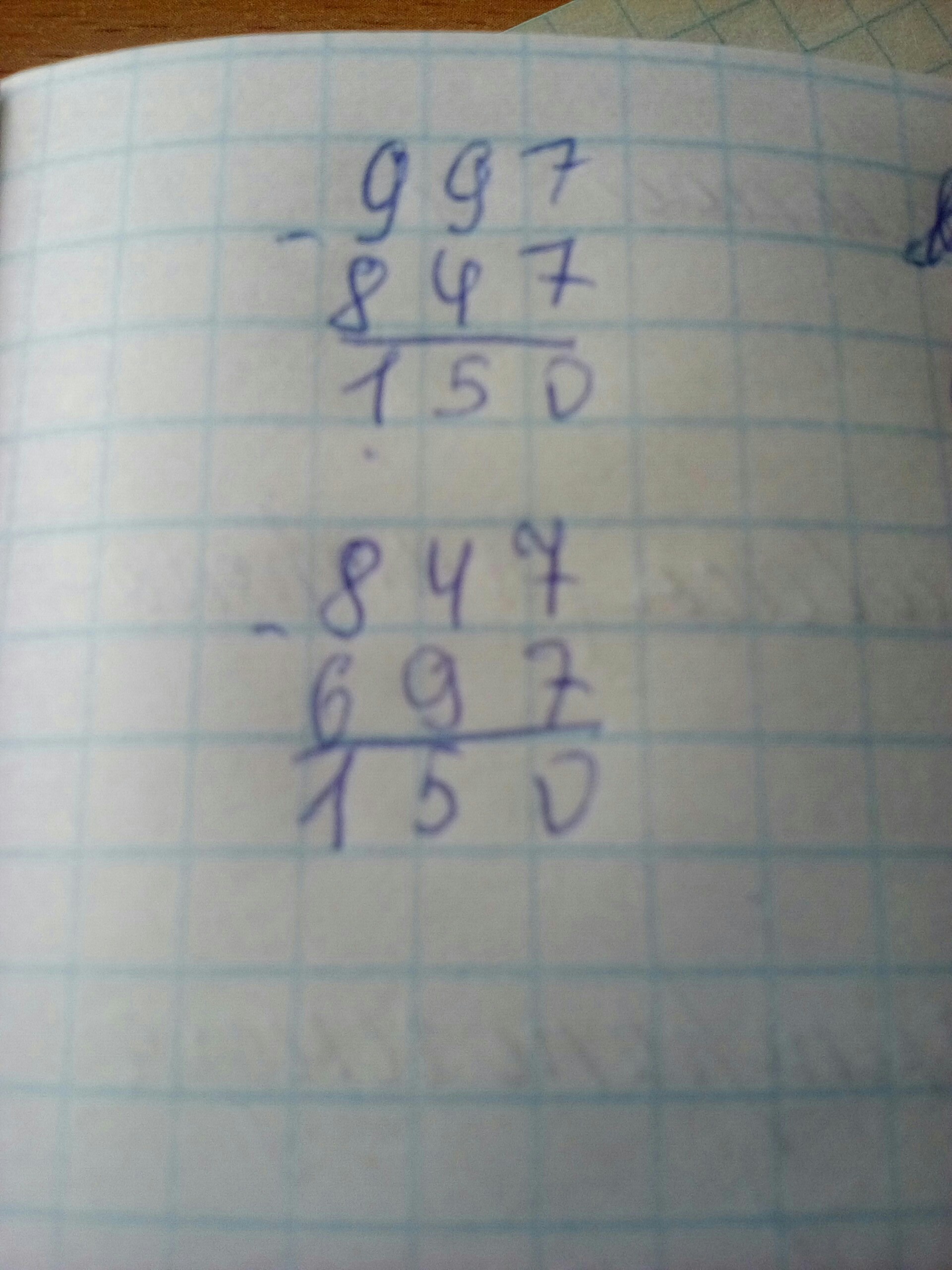 вычисли столбиком разность рядом стоящих чисел .установи закономерност.продолжи последовательность ёще на 3 числа,выполняя вычисления столбиком. 997 847 697