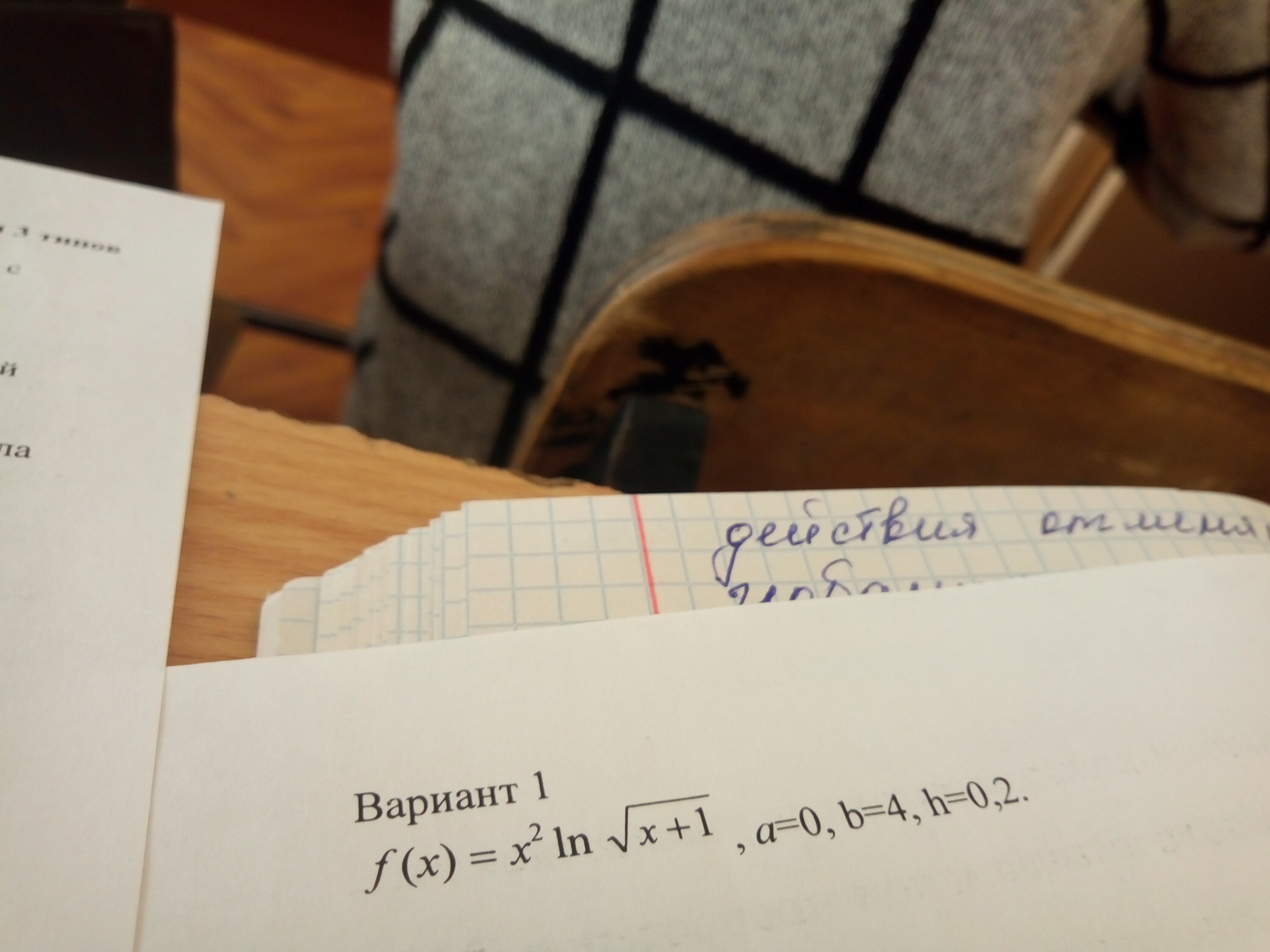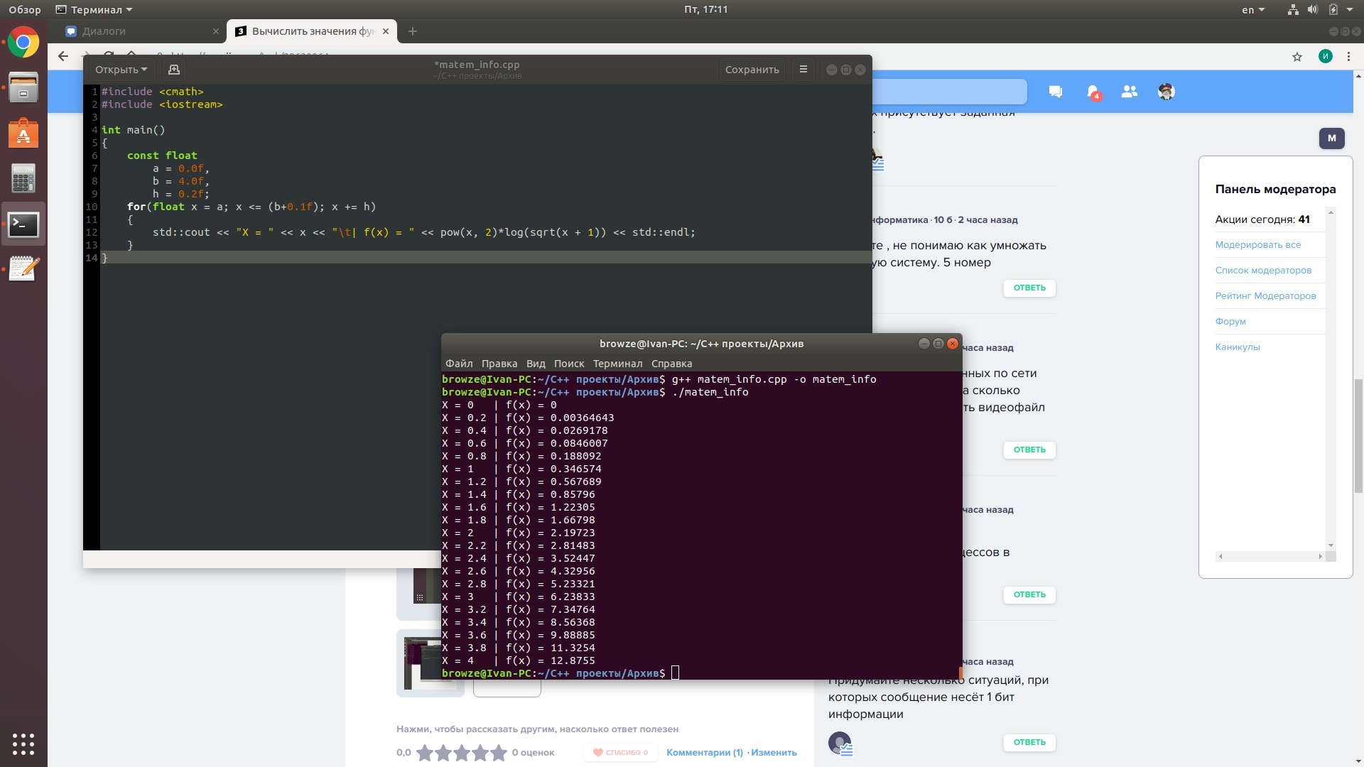 std::cout << "X = " << x << "t| f(x) = " << pow(x, 2)*log(sqrt(x + 1)) << std::endl;